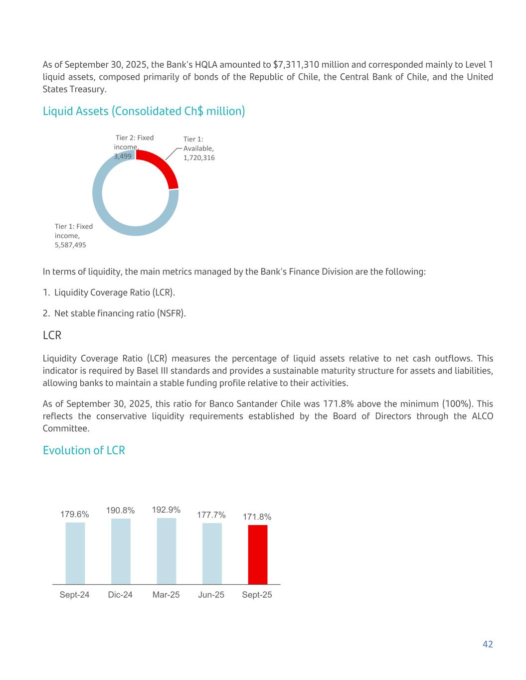 As of September 30, 2025, the Bank's HQLA amounted to $7,311,310 million and corresponded mainly to Level 1 liquid assets, composed primarily of bonds of the Republic of Chile, the Central Bank of Chile, and the United States Treasury. Liquid Assets (Consolidated Ch$ million) Tier 1: Available, 1,720,316 Tier 1: Fixed income, 5,587,495 Tier 2: Fixed income, 3,499 In terms of liquidity, the main metrics managed by the Bank's Finance Division are the following: 1. Liquidity Coverage Ratio (LCR). 2. Net stable financing ratio (NSFR). LCR Liquidity Coverage Ratio (LCR) measures the percentage of liquid assets relative to net cash outflows. This indicator is required by Basel III standards and provides a sustainable maturity structure for assets and liabilities, allowing banks to maintain a stable funding profile relative to their activities. As of September 30, 2025, this ratio for Banco Santander Chile was 171.8% above the minimum (100%). This reflects the conservative liquidity requirements established by the Board of Directors through the ALCO Committee. Evolution of LCR 179.6% 190.8% 192.9% 177.7% 171.8% Sept-24 Dic-24 Mar-25 Jun-25 Sept-25 42
