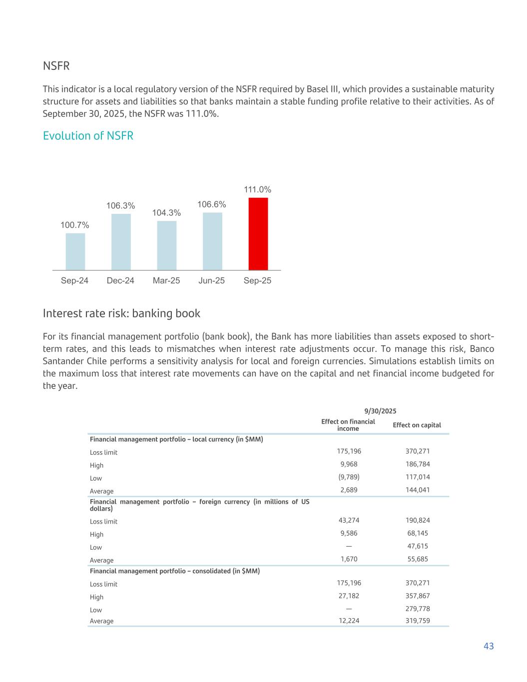 NSFR This indicator is a local regulatory version of the NSFR required by Basel III, which provides a sustainable maturity structure for assets and liabilities so that banks maintain a stable funding profile relative to their activities. As of September 30, 2025, the NSFR was 111.0%. Evolution of NSFR 100.7% 106.3% 104.3% 106.6% 111.0% Sep-24 Dec-24 Mar-25 Jun-25 Sep-25 Interest rate risk: banking book For its financial management portfolio (bank book), the Bank has more liabilities than assets exposed to short- term rates, and this leads to mismatches when interest rate adjustments occur. To manage this risk, Banco Santander Chile performs a sensitivity analysis for local and foreign currencies. Simulations establish limits on the maximum loss that interest rate movements can have on the capital and net financial income budgeted for the year. 9/30/2025 Effect on financial income Effect on capital Financial management portfolio – local currency (in $MM) Loss limit 175,196 370,271 High 9,968 186,784 Low (9,789) 117,014 Average 2,689 144,041 Financial management portfolio – foreign currency (in millions of US dollars) Loss limit 43,274 190,824 High 9,586 68,145 Low — 47,615 Average 1,670 55,685 Financial management portfolio – consolidated (in $MM) Loss limit 175,196 370,271 High 27,182 357,867 Low — 279,778 Average 12,224 319,759 43