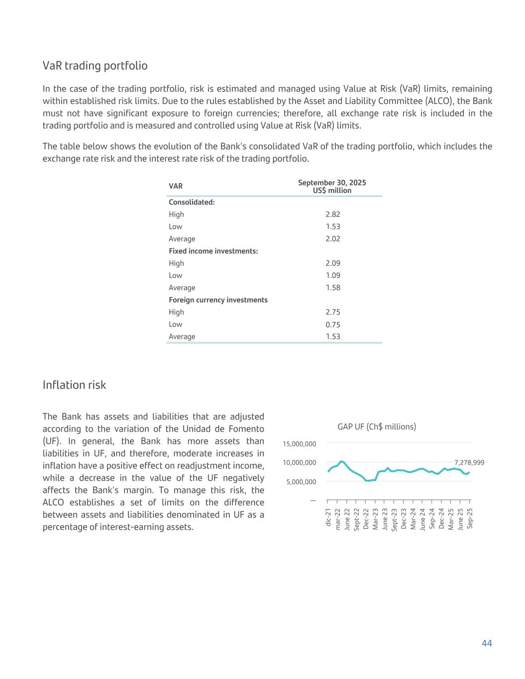 VaR trading portfolio In the case of the trading portfolio, risk is estimated and managed using Value at Risk (VaR) limits, remaining within established risk limits. Due to the rules established by the Asset and Liability Committee (ALCO), the Bank must not have significant exposure to foreign currencies; therefore, all exchange rate risk is included in the trading portfolio and is measured and controlled using Value at Risk (VaR) limits. The table below shows the evolution of the Bank's consolidated VaR of the trading portfolio, which includes the exchange rate risk and the interest rate risk of the trading portfolio. VAR September 30, 2025 US$ million Consolidated: High 2.82 Low 1.53 Average 2.02 Fixed income investments: High 2.09 Low 1.09 Average 1.58 Foreign currency investments High 2.75 Low 0.75 Average 1.53 Inflation risk The Bank has assets and liabilities that are adjusted according to the variation of the Unidad de Fomento (UF). In general, the Bank has more assets than liabilities in UF, and therefore, moderate increases in inflation have a positive effect on readjustment income, while a decrease in the value of the UF negatively affects the Bank's margin. To manage this risk, the ALCO establishes a set of limits on the difference between assets and liabilities denominated in UF as a percentage of interest-earning assets. GAP UF (Ch$ millions) 7,278,999 di c- 21 m ar -2 2 Ju ne 2 2 Se pt -2 2 De c- 22 M ar -2 3 Ju ne 2 3 Se pt -2 3 De c- 23 M ar -2 4 Ju ne 2 4 Se p- 24 De c- 24 M ar -2 5 Ju ne 2 5 Se p- 25 — 5,000,000 10,000,000 15,000,000 44