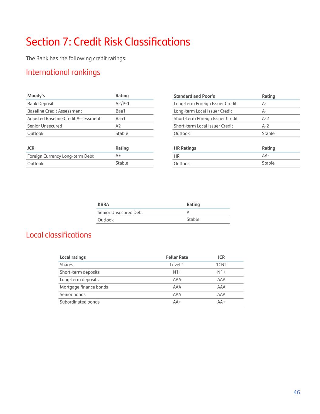 Section 7: Credit Risk Classifications The Bank has the following credit ratings: International rankings Moody's Rating Bank Deposit A2/P-1 Baseline Credit Assessment Baa1 Adjusted Baseline Credit Assessment Baa1 Senior Unsecured A2 Outlook Stable Standard and Poor's Rating Long-term Foreign Issuer Credit A- Long-term Local Issuer Credit A- Short-term Foreign Issuer Credit A-2 Short-term Local Issuer Credit A-2 Outlook Stable JCR Rating Foreign Currency Long-term Debt A+ Outlook Stable HR Ratings Rating HR AA- Outlook Stable KBRA Rating Senior Unsecured Debt A Outlook Stable Local classifications Local ratings Feller Rate ICR Shares Level 1 1CN1 Short-term deposits N1+ N1+ Long-term deposits AAA AAA Mortgage finance bonds AAA AAA Senior bonds AAA AAA Subordinated bonds AA+ AA+ 46