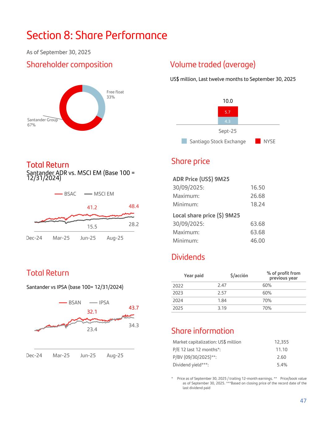 Section 8: Share Performance As of September 30, 2025 Shareholder composition Free float 33% Santander Group 67% Volume traded (average) US$ million, Last twelve months to September 30, 2025 10.0 4.3 5.7 Santiago Stock Exchange NYSE Sept-25 Total Return Santander ADR vs. MSCI EM (Base 100 = 12/31/2024) 41.2 48.4 15.5 28.2 BSAC MSCI EM Dec-24 Mar-25 Jun-25 Aug-25 Total Return Santander vs IPSA (base 100= 12/31/2024) 32.1 43.7 23.4 34.3 BSAN IPSA Dec-24 Mar-25 Jun-25 Aug-25 Share price ADR Price (US$) 9M25 30/09/2025: 16.50 Maximum: 26.68 Minimum: 18.24 Local share price ($) 9M25 30/09/2025: 63.68 Maximum: 63.68 Minimum: 46.00 Dividends Year paid $/acción % of profit from previous year 2022 2.47 60% 2023 2.57 60% 2024 1.84 70% 2025 3.19 70% Share information Market capitalization: US$ million 12,355 P/E 12 last 12 months*: 11.10 P/BV (09/30/2025)**: 2.60 Dividend yield***: 5.4% *     Price as of September 30, 2025 / trailing 12-month earnings. **    Price/book value as of September 30, 2025. ***Based on closing price of the record date of the last dividend paid 47