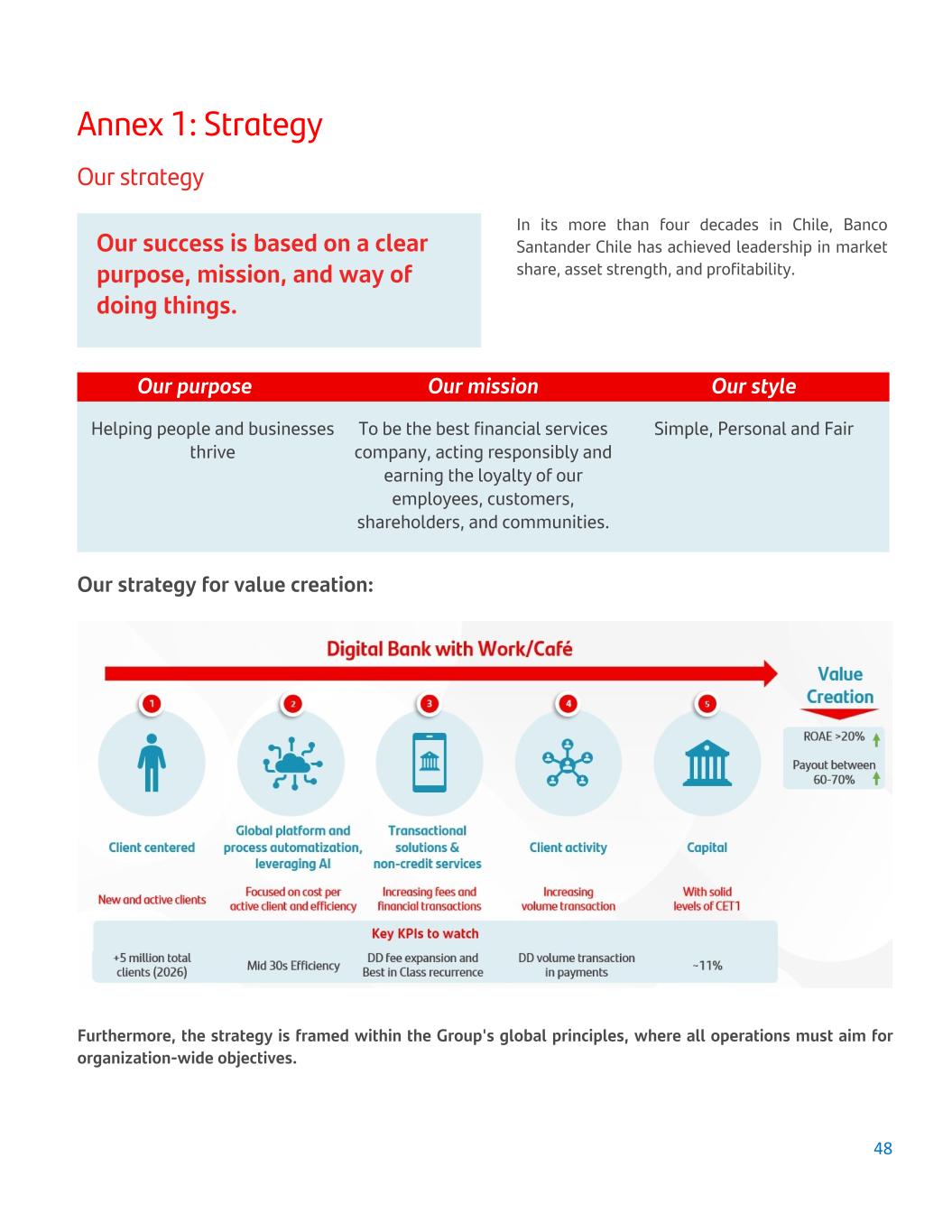 Annex 1: Strategy Our strategy In its more than four decades in Chile, Banco Santander Chile has achieved leadership in market share, asset strength, and profitability. Our success is based on a clear purpose, mission, and way of doing things. Our purpose Our mission Our style Helping people and businesses thrive To be the best financial services company, acting responsibly and earning the loyalty of our employees, customers, shareholders, and communities. Simple, Personal and Fair Our strategy for value creation: Furthermore, the strategy is framed within the Group's global principles, where all operations must aim for organization-wide objectives. 48