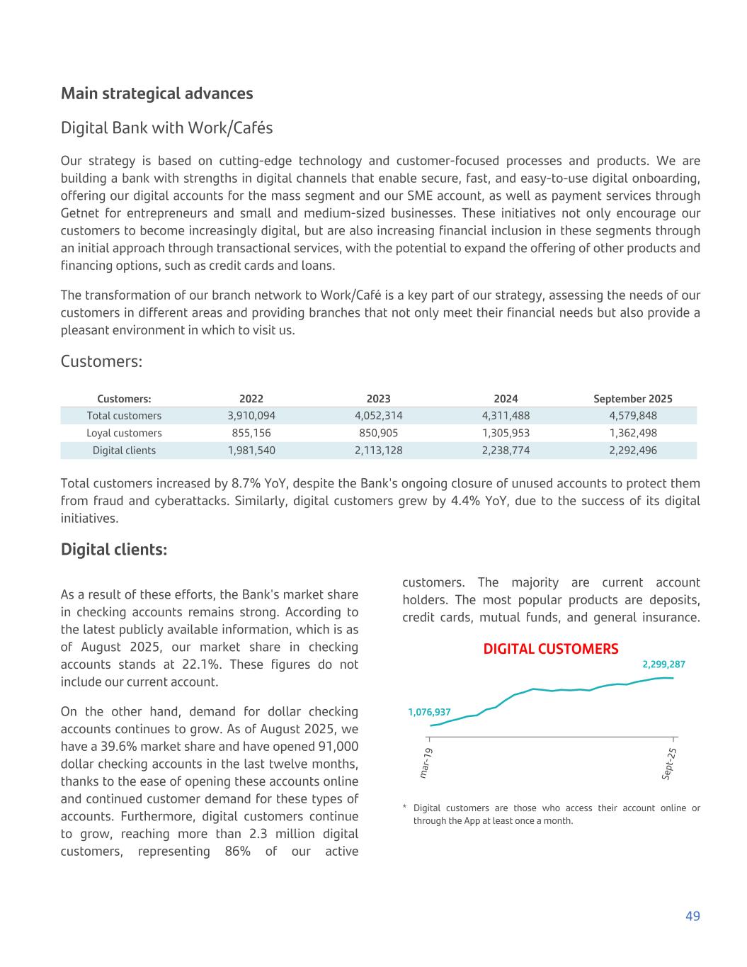 Main strategical advances Digital Bank with Work/Cafés Our strategy is based on cutting-edge technology and customer-focused processes and products. We are building a bank with strengths in digital channels that enable secure, fast, and easy-to-use digital onboarding, offering our digital accounts for the mass segment and our SME account, as well as payment services through Getnet for entrepreneurs and small and medium-sized businesses. These initiatives not only encourage our customers to become increasingly digital, but are also increasing financial inclusion in these segments through an initial approach through transactional services, with the potential to expand the offering of other products and financing options, such as credit cards and loans. The transformation of our branch network to Work/Café is a key part of our strategy, assessing the needs of our customers in different areas and providing branches that not only meet their financial needs but also provide a pleasant environment in which to visit us. Customers: Customers: 2022 2023 2024 September 2025 Total customers 3,910,094 4,052,314 4,311,488 4,579,848 Loyal customers 855,156 850,905 1,305,953 1,362,498 Digital clients 1,981,540 2,113,128 2,238,774 2,292,496 Total customers increased by 8.7% YoY, despite the Bank's ongoing closure of unused accounts to protect them from fraud and cyberattacks. Similarly, digital customers grew by 4.4% YoY, due to the success of its digital initiatives. Digital clients: As a result of these efforts, the Bank's market share in checking accounts remains strong. According to the latest publicly available information, which is as of August 2025, our market share in checking accounts stands at 22.1%. These figures do not include our current account. On the other hand, demand for dollar checking accounts continues to grow. As of August 2025, we have a 39.6% market share and have opened 91,000 dollar checking accounts in the last twelve months, thanks to the ease of opening these accounts online and continued customer demand for these types of accounts. Furthermore, digital customers continue to grow, reaching more than 2.3 million digital customers, representing 86% of our active customers. The majority are current account holders. The most popular products are deposits, credit cards, mutual funds, and general insurance. DIGITAL CUSTOMERS 1,076,937 2,299,287 m ar -1 9 Se pt -2 5 * Digital customers are those who access their account online or through the App at least once a month. 49