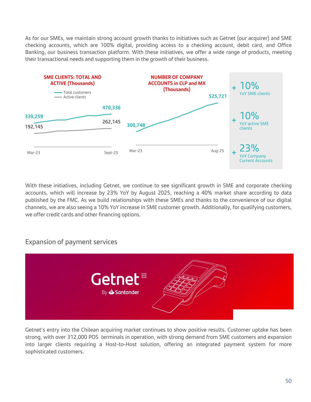 As for our SMEs, we maintain strong account growth thanks to initiatives such as Getnet (our acquirer) and SME checking accounts, which are 100% digital, providing access to a checking account, debit card, and Office Banking, our business transaction platform. With these initiatives, we offer a wide range of products, meeting their transactional needs and supporting them in the growth of their business. SME CLIENTS: TOTAL AND ACTIVE (Thousands) 339,259 470,336 192,145 262,145 Total customers Active clients Mar-23 Sept-25 NUMBER OF COMPANY ACCOUNTS in CLP and MX (Thousands) 300,748 525,721 Mar-23 Aug-25 + 10% YoY SME clients + 10% YoY active SME clients + 23% YoY Company Current Accounts With these initiatives, including Getnet, we continue to see significant growth in SME and corporate checking accounts, which will increase by 23% YoY by August 2025, reaching a 40% market share according to data published by the FMC. As we build relationships with these SMEs and thanks to the convenience of our digital channels, we are also seeing a 10% YoY increase in SME customer growth. Additionally, for qualifying customers, we offer credit cards and other financing options. Expansion of payment services Getnet's entry into the Chilean acquiring market continues to show positive results. Customer uptake has been strong, with over 312,000 POS terminals in operation, with strong demand from SME customers and expansion into larger clients requiring a Host-to-Host solution, offering an integrated payment system for more sophisticated customers. 50