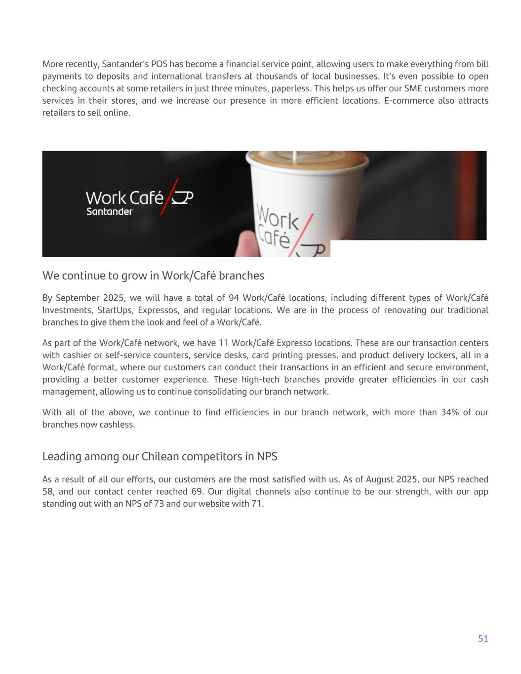 More recently, Santander's POS has become a financial service point, allowing users to make everything from bill payments to deposits and international transfers at thousands of local businesses. It's even possible to open checking accounts at some retailers in just three minutes, paperless. This helps us offer our SME customers more services in their stores, and we increase our presence in more efficient locations. E-commerce also attracts retailers to sell online. We continue to grow in Work/Café branches By September 2025, we will have a total of 94 Work/Café locations, including different types of Work/Café Investments, StartUps, Expressos, and regular locations. We are in the process of renovating our traditional branches to give them the look and feel of a Work/Café. As part of the Work/Café network, we have 11 Work/Café Expresso locations. These are our transaction centers with cashier or self-service counters, service desks, card printing presses, and product delivery lockers, all in a Work/Café format, where our customers can conduct their transactions in an efficient and secure environment, providing a better customer experience. These high-tech branches provide greater efficiencies in our cash management, allowing us to continue consolidating our branch network. With all of the above, we continue to find efficiencies in our branch network, with more than 34% of our branches now cashless. Leading among our Chilean competitors in NPS As a result of all our efforts, our customers are the most satisfied with us. As of August 2025, our NPS reached 58, and our contact center reached 69. Our digital channels also continue to be our strength, with our app standing out with an NPS of 73 and our website with 71. 51