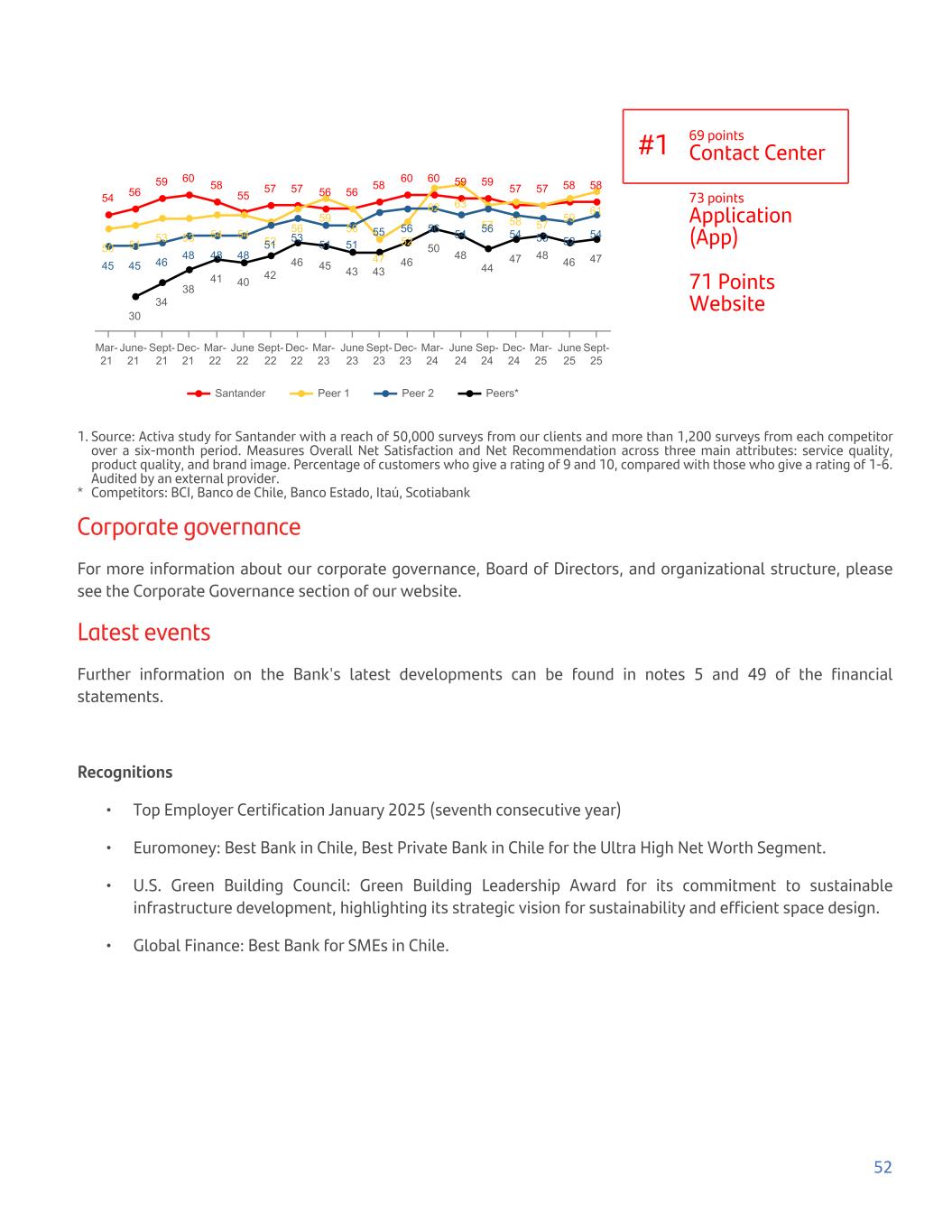 54 56 59 60 58 55 57 57 56 56 58 60 60 59 59 57 57 58 58 50 51 53 53 54 54 52 56 59 56 47 52 62 63 57 58 57 59 61 45 45 46 48 48 48 51 53 51 51 55 56 56 54 56 54 53 52 54 30 34 38 41 40 42 46 45 43 43 46 50 48 44 47 48 46 47 Santander Peer 1 Peer 2 Peers* Mar- 21 June- 21 Sept- 21 Dec- 21 Mar- 22 June 22 Sept- 22 Dec- 22 Mar- 23 June 23 Sept- 23 Dec- 23 Mar- 24 June 24 Sep- 24 Dec- 24 Mar- 25 June 25 Sept- 25 #1 69 points Contact Center 73 points Application (App) 71 Points Website 1. Source: Activa study for Santander with a reach of 50,000 surveys from our clients and more than 1,200 surveys from each competitor over a six-month period. Measures Overall Net Satisfaction and Net Recommendation across three main attributes: service quality, product quality, and brand image. Percentage of customers who give a rating of 9 and 10, compared with those who give a rating of 1-6. Audited by an external provider. * Competitors: BCI, Banco de Chile, Banco Estado, Itaú, Scotiabank Corporate governance For more information about our corporate governance, Board of Directors, and organizational structure, please see the Corporate Governance section of our website. Latest events Further information on the Bank's latest developments can be found in notes 5 and 49 of the financial statements. Recognitions • Top Employer Certification January 2025 (seventh consecutive year) • Euromoney: Best Bank in Chile, Best Private Bank in Chile for the Ultra High Net Worth Segment. • U.S. Green Building Council: Green Building Leadership Award for its commitment to sustainable infrastructure development, highlighting its strategic vision for sustainability and efficient space design. • Global Finance: Best Bank for SMEs in Chile. 52