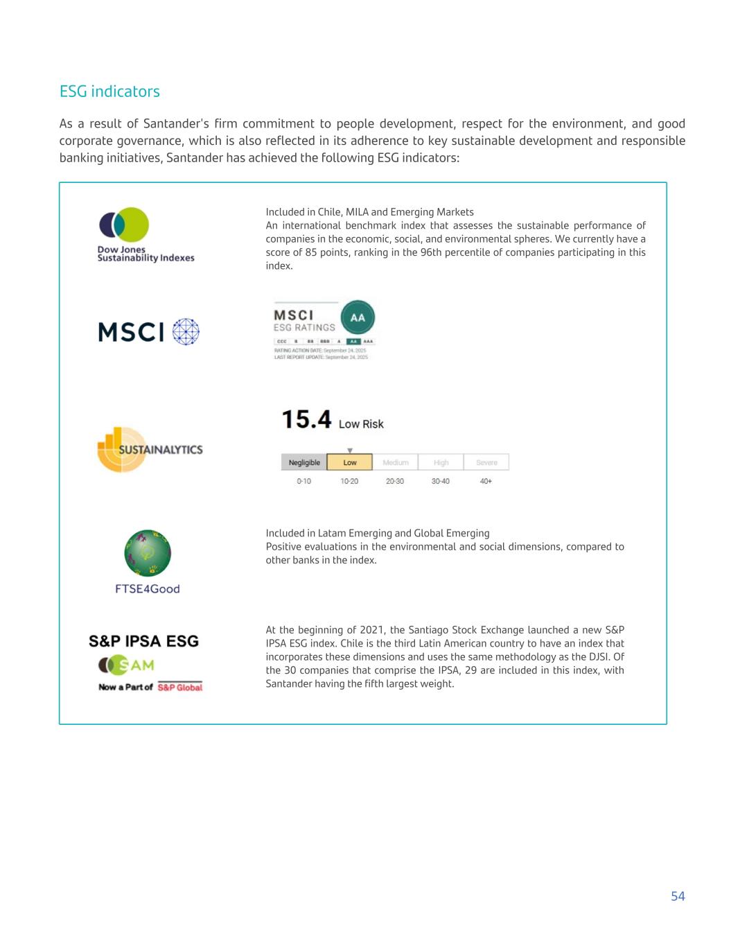 ESG indicators As a result of Santander's firm commitment to people development, respect for the environment, and good corporate governance, which is also reflected in its adherence to key sustainable development and responsible banking initiatives, Santander has achieved the following ESG indicators: Included in Chile, MILA and Emerging Markets An international benchmark index that assesses the sustainable performance of companies in the economic, social, and environmental spheres. We currently have a score of 85 points, ranking in the 96th percentile of companies participating in this index. Included in Latam Emerging and Global Emerging Positive evaluations in the environmental and social dimensions, compared to other banks in the index. At the beginning of 2021, the Santiago Stock Exchange launched a new S&P IPSA ESG index. Chile is the third Latin American country to have an index that incorporates these dimensions and uses the same methodology as the DJSI. Of the 30 companies that comprise the IPSA, 29 are included in this index, with Santander having the fifth largest weight. 54