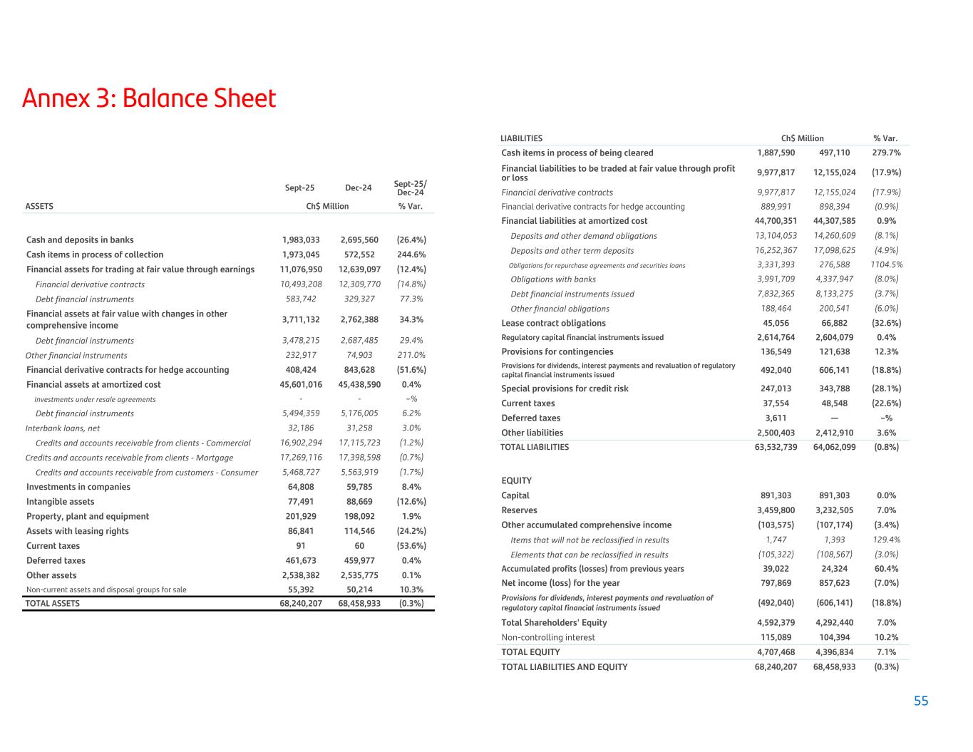 Annex 3: Balance Sheet Sept-25 Dec-24 Sept-25/ Dec-24 ASSETS Ch$ Million % Var. Cash and deposits in banks 1,983,033 2,695,560 (26.4%) Cash items in process of collection 1,973,045 572,552 244.6% Financial assets for trading at fair value through earnings 11,076,950 12,639,097 (12.4%) Financial derivative contracts 10,493,208 12,309,770 (14.8%) Debt financial instruments 583,742 329,327 77.3% Financial assets at fair value with changes in other comprehensive income 3,711,132 2,762,388 34.3% Debt financial instruments 3,478,215 2,687,485 29.4% Other financial instruments 232,917 74,903 211.0% Financial derivative contracts for hedge accounting 408,424 843,628 (51.6%) Financial assets at amortized cost 45,601,016 45,438,590 0.4% Investments under resale agreements - - –% Debt financial instruments 5,494,359 5,176,005 6.2% Interbank loans, net 32,186 31,258 3.0% Credits and accounts receivable from clients - Commercial 16,902,294 17,115,723 (1.2%) Credits and accounts receivable from clients - Mortgage 17,269,116 17,398,598 (0.7%) Credits and accounts receivable from customers - Consumer 5,468,727 5,563,919 (1.7%) Investments in companies 64,808 59,785 8.4% Intangible assets 77,491 88,669 (12.6%) Property, plant and equipment 201,929 198,092 1.9% Assets with leasing rights 86,841 114,546 (24.2%) Current taxes 91 60 (53.6%) Deferred taxes 461,673 459,977 0.4% Other assets 2,538,382 2,535,775 0.1% Non-current assets and disposal groups for sale 55,392 50,214 10.3% TOTAL ASSETS 68,240,207 68,458,933 (0.3%) LIABILITIES Ch$ Million % Var. Cash items in process of being cleared 1,887,590 497,110 279.7% Financial liabilities to be traded at fair value through profit or loss 9,977,817 12,155,024 (17.9%) Financial derivative contracts 9,977,817 12,155,024 (17.9%) Financial derivative contracts for hedge accounting 889,991 898,394 (0.9%) Financial liabilities at amortized cost 44,700,351 44,307,585 0.9% Deposits and other demand obligations 13,104,053 14,260,609 (8.1%) Deposits and other term deposits 16,252,367 17,098,625 (4.9%) Obligations for repurchase agreements and securities loans 3,331,393 276,588 1104.5% Obligations with banks 3,991,709 4,337,947 (8.0%) Debt financial instruments issued 7,832,365 8,133,275 (3.7%) Other financial obligations 188,464 200,541 (6.0%) Lease contract obligations 45,056 66,882 (32.6%) Regulatory capital financial instruments issued 2,614,764 2,604,079 0.4% Provisions for contingencies 136,549 121,638 12.3% Provisions for dividends, interest payments and revaluation of regulatory capital financial instruments issued 492,040 606,141 (18.8%) Special provisions for credit risk 247,013 343,788 (28.1%) Current taxes 37,554 48,548 (22.6%) Deferred taxes 3,611 — –% Other liabilities 2,500,403 2,412,910 3.6% TOTAL LIABILITIES 63,532,739 64,062,099 (0.8%) EQUITY Capital 891,303 891,303 0.0% Reserves 3,459,800 3,232,505 7.0% Other accumulated comprehensive income (103,575) (107,174) (3.4%) Items that will not be reclassified in results 1,747 1,393 129.4% Elements that can be reclassified in results (105,322) (108,567) (3.0%) Accumulated profits (losses) from previous years 39,022 24,324 60.4% Net income (loss) for the year 797,869 857,623 (7.0%) Provisions for dividends, interest payments and revaluation of regulatory capital financial instruments issued (492,040) (606,141) (18.8%) Total Shareholders' Equity 4,592,379 4,292,440 7.0% Non-controlling interest 115,089 104,394 10.2% TOTAL EQUITY 4,707,468 4,396,834 7.1% TOTAL LIABILITIES AND EQUITY 68,240,207 68,458,933 (0.3%) 55