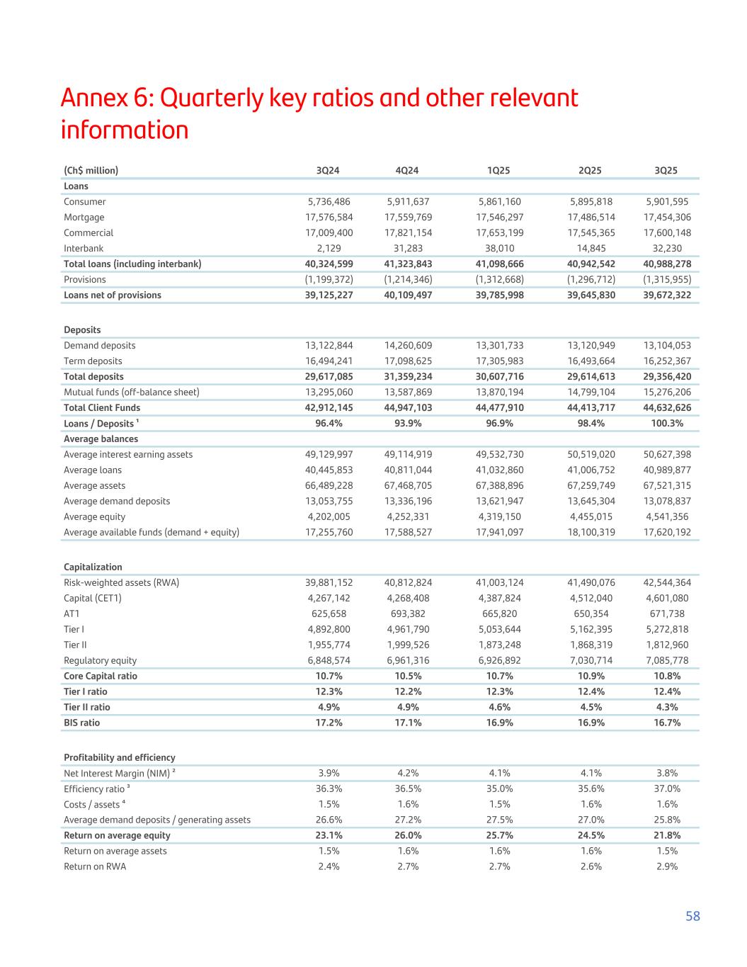 Annex 6: Quarterly key ratios and other relevant information (Ch$ million) 3Q24 4Q24 1Q25 2Q25 3Q25 Loans Consumer 5,736,486 5,911,637 5,861,160 5,895,818 5,901,595 Mortgage 17,576,584 17,559,769 17,546,297 17,486,514 17,454,306 Commercial 17,009,400 17,821,154 17,653,199 17,545,365 17,600,148 Interbank 2,129 31,283 38,010 14,845 32,230 Total loans (including interbank) 40,324,599 41,323,843 41,098,666 40,942,542 40,988,278 Provisions (1,199,372) (1,214,346) (1,312,668) (1,296,712) (1,315,955) Loans net of provisions 39,125,227 40,109,497 39,785,998 39,645,830 39,672,322 Deposits Demand deposits 13,122,844 14,260,609 13,301,733 13,120,949 13,104,053 Term deposits 16,494,241 17,098,625 17,305,983 16,493,664 16,252,367 Total deposits 29,617,085 31,359,234 30,607,716 29,614,613 29,356,420 Mutual funds (off-balance sheet) 13,295,060 13,587,869 13,870,194 14,799,104 15,276,206 Total Client Funds 42,912,145 44,947,103 44,477,910 44,413,717 44,632,626 Loans / Deposits ¹ 96.4% 93.9% 96.9% 98.4% 100.3% Average balances Average interest earning assets 49,129,997 49,114,919 49,532,730 50,519,020 50,627,398 Average loans 40,445,853 40,811,044 41,032,860 41,006,752 40,989,877 Average assets 66,489,228 67,468,705 67,388,896 67,259,749 67,521,315 Average demand deposits 13,053,755 13,336,196 13,621,947 13,645,304 13,078,837 Average equity 4,202,005 4,252,331 4,319,150 4,455,015 4,541,356 Average available funds (demand + equity) 17,255,760 17,588,527 17,941,097 18,100,319 17,620,192 Capitalization Risk-weighted assets (RWA) 39,881,152 40,812,824 41,003,124 41,490,076 42,544,364 Capital (CET1) 4,267,142 4,268,408 4,387,824 4,512,040 4,601,080 AT1 625,658 693,382 665,820 650,354 671,738 Tier I 4,892,800 4,961,790 5,053,644 5,162,395 5,272,818 Tier II 1,955,774 1,999,526 1,873,248 1,868,319 1,812,960 Regulatory equity 6,848,574 6,961,316 6,926,892 7,030,714 7,085,778 Core Capital ratio 10.7% 10.5% 10.7% 10.9% 10.8% Tier I ratio 12.3% 12.2% 12.3% 12.4% 12.4% Tier II ratio 4.9% 4.9% 4.6% 4.5% 4.3% BIS ratio 17.2% 17.1% 16.9% 16.9% 16.7% Profitability and efficiency Net Interest Margin (NIM) ² 3.9% 4.2% 4.1% 4.1% 3.8% Efficiency ratio ³ 36.3% 36.5% 35.0% 35.6% 37.0% Costs / assets ⁴ 1.5% 1.6% 1.5% 1.6% 1.6% Average demand deposits / generating assets 26.6% 27.2% 27.5% 27.0% 25.8% Return on average equity 23.1% 26.0% 25.7% 24.5% 21.8% Return on average assets 1.5% 1.6% 1.6% 1.6% 1.5% Return on RWA 2.4% 2.7% 2.7% 2.6% 2.9% 58