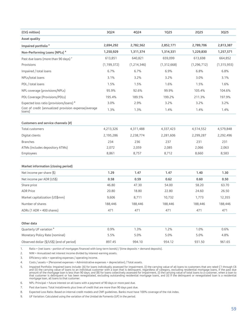 (Ch$ million) 3Q24 4Q24 1Q25 2Q25 3Q25 Asset quality Impaired portfolio ⁵ 2,694,292 2,782,562 2,852,171 2,789,706 2,813,387 Non-Performing Loans (NPLs) ⁶ 1,250,929 1,311,374 1,314,331 1,229,830 1,257,571 Past due loans (more than 90 days) ⁷ 613,851 640,821 659,099 613,698 664,852 Provisions (1,199,372) (1,214,346) (1,312,668) (1,296,712) (1,315,955) Impaired / total loans 6.7% 6.7% 6.9% 6.8% 6.8% NPLs/total loans 3.1% 3.2% 3.2% 3.0% 3.1% PDL / total loans 1.5% 1.5% 1.6% 1.5% 1.6% NPL coverage (provisions/NPLs) 95.9% 92.6% 99.9% 105.4% 104.6% PDL Coverage (Provisions/PDLs) 195.4% 189.5% 199.2% 211.3% 197.9% Expected loss ratio (provisions/loans) ⁸ 3.0% 2.9% 3.2% 3.2% 3.2% Cost of credit (annualized provision expense/average loans) 1.3% 1.3% 1.4% 1.4% 1.4% Customers and service channels (#) Total customers 4,213,326 4,311,488 4,337,423 4,514,552 4,579,848 Digital clients 2,195,286 2,238,774 2,281,606 2,299,287 2,292,496 Branches 234 236 237 231 231 ATMs (includes depository ATMs) 2,072 2,059 2,085 2,066 2,063 Employees 8,861 8,757 8,712 8,660 8,583 Market information (closing period) Net income per share ($) 1.29 1.47 1.47 1.40 1.30 Net income per ADR (US$) 0.58 0.59 0.62 0.60 0.50 Share price 46.80 47.30 54.00 58.20 63.70 ADR Price 20.80 18.80 22.80 24.60 26.50 Market capitalization (US$mm) 9,606 8,711 10,732 1,773 12,355 Number of shares 188,446 188,446 188,446 188,446 188,446 ADRs (1 ADR = 400 shares) 471 471 471 471 471 Other data Quarterly UF variation ⁹ 0.9% 1.3% 1.2% 1.0% 0.6% Monetary Policy Rate (nominal) 5.5% 5.0% 5.0% 5.0% 4.8% Observed dollar ($/US$) (end of period) 897.45 994.10 954.12 931.50 961.65 1. Ratio = (net loans - portion of mortgages financed with long-term bonds) / (time deposits + demand deposits). 2. NIM = Annualized net interest income divided by interest-earning assets. 3. Efficiency ratio = operating expenses / operating income. 4. Costs / assets = (Personnel expenses + Administrative expenses + depreciation) / Total assets. 5. Impaired Portfolio: Impaired loans include: (A) for loans individually assessed for impairment, (i) the carrying value of all loans to customers that are rated C1 through C6 and (ii) the carrying value of loans to an individual customer with a loan that is delinquent, regardless of category, excluding residential mortgage loans, if the past due amount of the mortgage loan is less than 90 days; and (B) for loans collectively assessed for impairment, (i) the carrying value of total loans to a customer, when a loan to that customer is delinquent or has been renegotiated, excluding outstanding residential mortgage loans, and (ii) if the delinquent or renegotiated loan is a residential mortgage loan, all loans to that customer. 6. NPL: Principal + future interest on all loans with a payment of 90 days or more past due. 7. Past due loans: Total installments plus lines of credit that are more than 90 days past due. 8. Expected Loss Ratio: Based on internal credit models and CMF guidelines. Banks must have 100% coverage of the risk index. 9. UF Variation: Calculated using the variation of the Unidad de Fomento (UF) in the period. 59