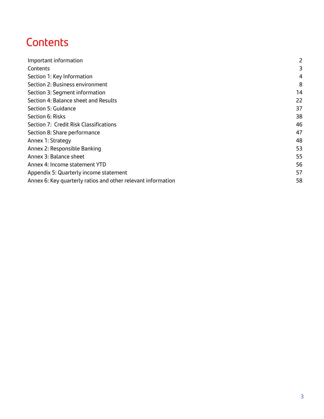 Contents Important information 2 Contents 3 Section 1: Key Information 4 Section 2: Business environment 8 Section 3: Segment information 14 Section 4: Balance sheet and Results 22 Section 5: Guidance 37 Section 6: Risks 38 Section 7: Credit Risk Classifications 46 Section 8: Share performance 47 Annex 1: Strategy 48 Annex 2: Responsible Banking 53 Annex 3: Balance sheet 55 Annex 4: Income statement YTD 56 Appendix 5: Quarterly income statement 57 Annex 6: Key quarterly ratios and other relevant information 58 3