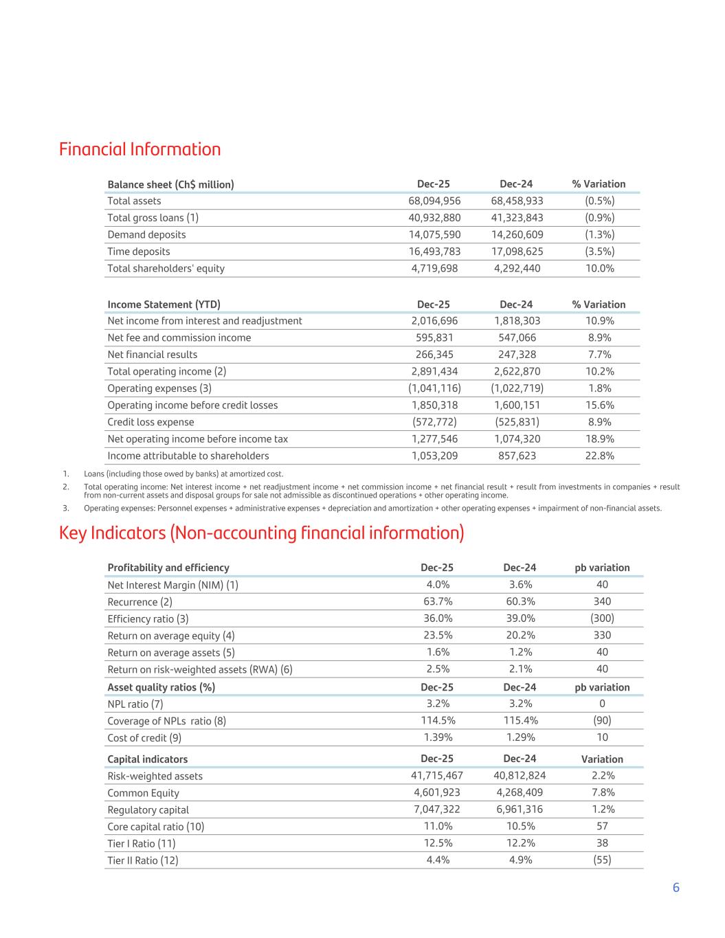 Financial Information Balance sheet (Ch$ million) Dec-25 Dec-24 % Variation Total assets 68,094,956 68,458,933 (0.5%) Total gross loans (1) 40,932,880 41,323,843 (0.9%) Demand deposits 14,075,590 14,260,609 (1.3%) Time deposits 16,493,783 17,098,625 (3.5%) Total shareholders' equity 4,719,698 4,292,440 10.0% Income Statement (YTD) Dec-25 Dec-24 % Variation Net income from interest and readjustment 2,016,696 1,818,303 10.9% Net fee and commission income 595,831 547,066 8.9% Net financial results 266,345 247,328 7.7% Total operating income (2) 2,891,434 2,622,870 10.2% Operating expenses (3) (1,041,116) (1,022,719) 1.8% Operating income before credit losses 1,850,318 1,600,151 15.6% Credit loss expense (572,772) (525,831) 8.9% Net operating income before income tax 1,277,546 1,074,320 18.9% Income attributable to shareholders 1,053,209 857,623 22.8% 1. Loans (including those owed by banks) at amortized cost. 2. Total operating income: Net interest income + net readjustment income + net commission income + net financial result + result from investments in companies + result from non-current assets and disposal groups for sale not admissible as discontinued operations + other operating income. 3. Operating expenses: Personnel expenses + administrative expenses + depreciation and amortization + other operating expenses + impairment of non-financial assets. Key Indicators (Non-accounting financial information) Profitability and efficiency Dec-25 Dec-24 pb variation Net Interest Margin (NIM) (1) 4.0% 3.6% 40 Recurrence (2) 63.7% 60.3% 340 Efficiency ratio (3) 36.0% 39.0% (300) Return on average equity (4) 23.5% 20.2% 330 Return on average assets (5) 1.6% 1.2% 40 Return on risk-weighted assets (RWA) (6) 2.5% 2.1% 40 Asset quality ratios (%) Dec-25 Dec-24 pb variation NPL ratio (7) 3.2% 3.2% 0 Coverage of NPLs ratio (8) 114.5% 115.4% (90) Cost of credit (9) 1.39% 1.29% 10 Capital indicators Dec-25 Dec-24 Variation Risk-weighted assets 41,715,467 40,812,824 2.2% Common Equity 4,601,923 4,268,409 7.8% Regulatory capital 7,047,322 6,961,316 1.2% Core capital ratio (10) 11.0% 10.5% 57 Tier I Ratio (11) 12.5% 12.2% 38 Tier II Ratio (12) 4.4% 4.9% (55) 6