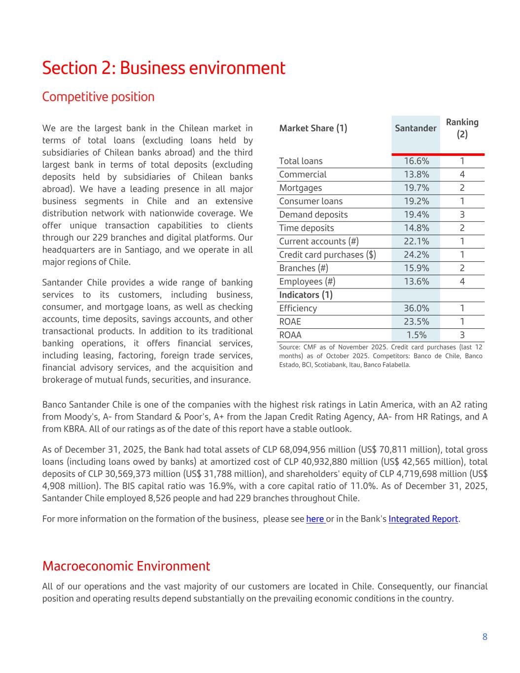 Section 2: Business environment Competitive position We are the largest bank in the Chilean market in terms of total loans (excluding loans held by subsidiaries of Chilean banks abroad) and the third largest bank in terms of total deposits (excluding deposits held by subsidiaries of Chilean banks abroad). We have a leading presence in all major business segments in Chile and an extensive distribution network with nationwide coverage. We offer unique transaction capabilities to clients through our 229 branches and digital platforms. Our headquarters are in Santiago, and we operate in all major regions of Chile. Santander Chile provides a wide range of banking services to its customers, including business, consumer, and mortgage loans, as well as checking accounts, time deposits, savings accounts, and other transactional products. In addition to its traditional banking operations, it offers financial services, including leasing, factoring, foreign trade services, financial advisory services, and the acquisition and brokerage of mutual funds, securities, and insurance. Market Share (1) Santander Ranking (2) Total loans 16.6% 1 Commercial 13.8% 4 Mortgages 19.7% 2 Consumer loans 19.2% 1 Demand deposits 19.4% 3 Time deposits 14.8% 2 Current accounts (#) 22.1% 1 Credit card purchases ($) 24.2% 1 Branches (#) 15.9% 2 Employees (#) 13.6% 4 Indicators (1) Efficiency 36.0% 1 ROAE 23.5% 1 ROAA 1.5% 3 Source: CMF as of November 2025. Credit card purchases (last 12 months) as of October 2025. Competitors: Banco de Chile, Banco Estado, BCI, Scotiabank, Itau, Banco Falabella. Banco Santander Chile is one of the companies with the highest risk ratings in Latin America, with an A2 rating from Moody's, A- from Standard & Poor's, A+ from the Japan Credit Rating Agency, AA- from HR Ratings, and A from KBRA. All of our ratings as of the date of this report have a stable outlook. As of December 31, 2025, the Bank had total assets of CLP 68,094,956 million (US$ 70,811 million), total gross loans (including loans owed by banks) at amortized cost of CLP 40,932,880 million (US$ 42,565 million), total deposits of CLP 30,569,373 million (US$ 31,788 million), and shareholders' equity of CLP 4,719,698 million (US$ 4,908 million). The BIS capital ratio was 16.9%, with a core capital ratio of 11.0%. As of December 31, 2025, Santander Chile employed 8,526 people and had 229 branches throughout Chile. For more information on the formation of the business, please see here or in the Bank's Integrated Report. Macroeconomic Environment All of our operations and the vast majority of our customers are located in Chile. Consequently, our financial position and operating results depend substantially on the prevailing economic conditions in the country. 8