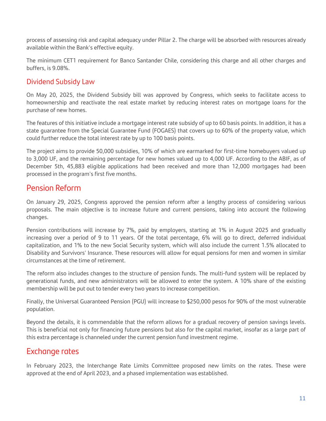 process of assessing risk and capital adequacy under Pillar 2. The charge will be absorbed with resources already available within the Bank's effective equity. The minimum CET1 requirement for Banco Santander Chile, considering this charge and all other charges and buffers, is 9.08%. Dividend Subsidy Law On May 20, 2025, the Dividend Subsidy bill was approved by Congress, which seeks to facilitate access to homeownership and reactivate the real estate market by reducing interest rates on mortgage loans for the purchase of new homes. The features of this initiative include a mortgage interest rate subsidy of up to 60 basis points. In addition, it has a state guarantee from the Special Guarantee Fund (FOGAES) that covers up to 60% of the property value, which could further reduce the total interest rate by up to 100 basis points. The project aims to provide 50,000 subsidies, 10% of which are earmarked for first-time homebuyers valued up to 3,000 UF, and the remaining percentage for new homes valued up to 4,000 UF. According to the ABIF, as of December 5th, 45,883 eligible applications had been received and more than 12,000 mortgages had been processed in the program's first five months. Pension Reform On January 29, 2025, Congress approved the pension reform after a lengthy process of considering various proposals. The main objective is to increase future and current pensions, taking into account the following changes. Pension contributions will increase by 7%, paid by employers, starting at 1% in August 2025 and gradually increasing over a period of 9 to 11 years. Of the total percentage, 6% will go to direct, deferred individual capitalization, and 1% to the new Social Security system, which will also include the current 1.5% allocated to Disability and Survivors' Insurance. These resources will allow for equal pensions for men and women in similar circumstances at the time of retirement. The reform also includes changes to the structure of pension funds. The multi-fund system will be replaced by generational funds, and new administrators will be allowed to enter the system. A 10% share of the existing membership will be put out to tender every two years to increase competition. Finally, the Universal Guaranteed Pension (PGU) will increase to $250,000 pesos for 90% of the most vulnerable population. Beyond the details, it is commendable that the reform allows for a gradual recovery of pension savings levels. This is beneficial not only for financing future pensions but also for the capital market, insofar as a large part of this extra percentage is channeled under the current pension fund investment regime. Exchange rates In February 2023, the Interchange Rate Limits Committee proposed new limits on the rates. These were approved at the end of April 2023, and a phased implementation was established. 11