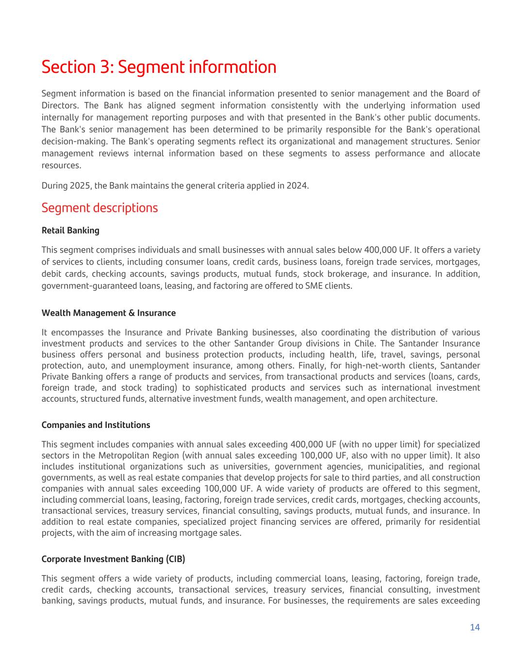 Section 3: Segment information Segment information is based on the financial information presented to senior management and the Board of Directors. The Bank has aligned segment information consistently with the underlying information used internally for management reporting purposes and with that presented in the Bank's other public documents. The Bank's senior management has been determined to be primarily responsible for the Bank's operational decision-making. The Bank's operating segments reflect its organizational and management structures. Senior management reviews internal information based on these segments to assess performance and allocate resources. During 2025, the Bank maintains the general criteria applied in 2024. Segment descriptions Retail Banking This segment comprises individuals and small businesses with annual sales below 400,000 UF. It offers a variety of services to clients, including consumer loans, credit cards, business loans, foreign trade services, mortgages, debit cards, checking accounts, savings products, mutual funds, stock brokerage, and insurance. In addition, government-guaranteed loans, leasing, and factoring are offered to SME clients. Wealth Management & Insurance It encompasses the Insurance and Private Banking businesses, also coordinating the distribution of various investment products and services to the other Santander Group divisions in Chile. The Santander Insurance business offers personal and business protection products, including health, life, travel, savings, personal protection, auto, and unemployment insurance, among others. Finally, for high-net-worth clients, Santander Private Banking offers a range of products and services, from transactional products and services (loans, cards, foreign trade, and stock trading) to sophisticated products and services such as international investment accounts, structured funds, alternative investment funds, wealth management, and open architecture. Companies and Institutions This segment includes companies with annual sales exceeding 400,000 UF (with no upper limit) for specialized sectors in the Metropolitan Region (with annual sales exceeding 100,000 UF, also with no upper limit). It also includes institutional organizations such as universities, government agencies, municipalities, and regional governments, as well as real estate companies that develop projects for sale to third parties, and all construction companies with annual sales exceeding 100,000 UF. A wide variety of products are offered to this segment, including commercial loans, leasing, factoring, foreign trade services, credit cards, mortgages, checking accounts, transactional services, treasury services, financial consulting, savings products, mutual funds, and insurance. In addition to real estate companies, specialized project financing services are offered, primarily for residential projects, with the aim of increasing mortgage sales. Corporate Investment Banking (CIB) This segment offers a wide variety of products, including commercial loans, leasing, factoring, foreign trade, credit cards, checking accounts, transactional services, treasury services, financial consulting, investment banking, savings products, mutual funds, and insurance. For businesses, the requirements are sales exceeding 14