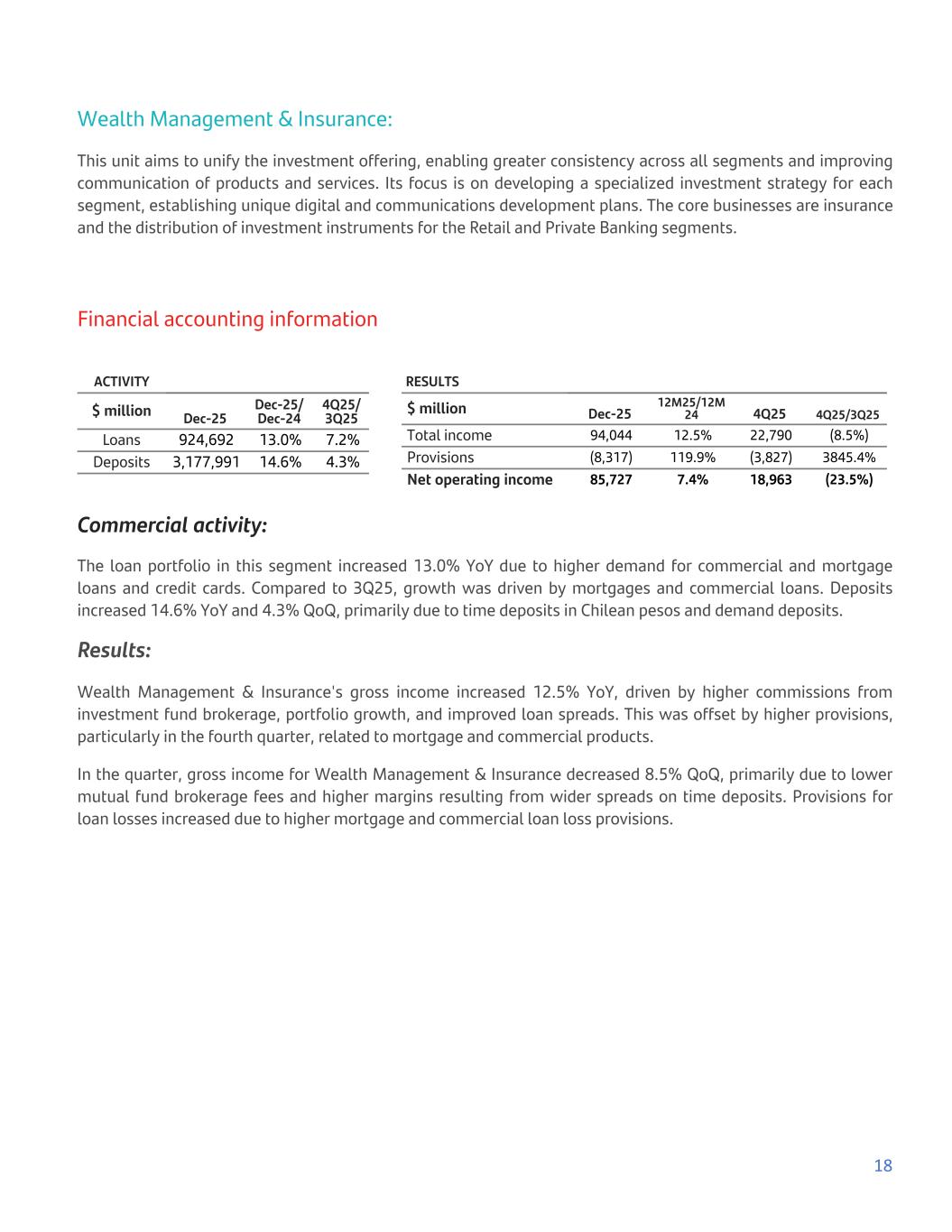 Wealth Management & Insurance: This unit aims to unify the investment offering, enabling greater consistency across all segments and improving communication of products and services. Its focus is on developing a specialized investment strategy for each segment, establishing unique digital and communications development plans. The core businesses are insurance and the distribution of investment instruments for the Retail and Private Banking segments. Financial accounting information ACTIVITY $ million Dec-25 Dec-25/ Dec-24 4Q25/ 3Q25 Loans 924,692 13.0% 7.2% Deposits 3,177,991 14.6% 4.3% RESULTS $ million Dec-25 12M25/12M 24 4Q25 4Q25/3Q25 Total income 94,044 12.5% 22,790 (8.5%) Provisions (8,317) 119.9% (3,827) 3845.4% Net operating income 85,727 7.4% 18,963 (23.5%) Commercial activity: The loan portfolio in this segment increased 13.0% YoY due to higher demand for commercial and mortgage loans and credit cards. Compared to 3Q25, growth was driven by mortgages and commercial loans. Deposits increased 14.6% YoY and 4.3% QoQ, primarily due to time deposits in Chilean pesos and demand deposits. Results: Wealth Management & Insurance's gross income increased 12.5% YoY, driven by higher commissions from investment fund brokerage, portfolio growth, and improved loan spreads. This was offset by higher provisions, particularly in the fourth quarter, related to mortgage and commercial products. In the quarter, gross income for Wealth Management & Insurance decreased 8.5% QoQ, primarily due to lower mutual fund brokerage fees and higher margins resulting from wider spreads on time deposits. Provisions for loan losses increased due to higher mortgage and commercial loan loss provisions. 18