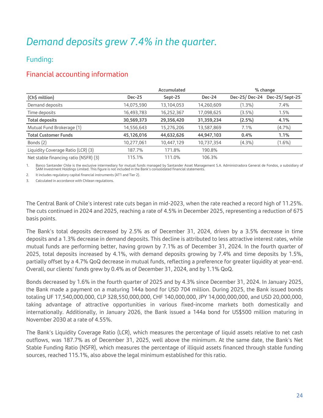 Demand deposits grew 7.4% in the quarter. Funding: Financial accounting information Accumulated % change (Ch$ million) Dec-25 Sept-25 Dec-24 Dec-25/ Dec-24 Dec-25/ Sept-25 Demand deposits 14,075,590 13,104,053 14,260,609 (1.3%) 7.4% Time deposits 16,493,783 16,252,367 17,098,625 (3.5%) 1.5% Total deposits 30,569,373 29,356,420 31,359,234 (2.5%) 4.1% Mutual Fund Brokerage (1) 14,556,643 15,276,206 13,587,869 7.1% (4.7%) Total Customer Funds 45,126,016 44,632,626 44,947,103 0.4% 1.1% Bonds (2) 10,277,061 10,447,129 10,737,354 (4.3%) (1.6%) Liquidity Coverage Ratio (LCR) (3) 187.7% 171.8% 190.8% Net stable financing ratio (NSFR) (3) 115.1% 111.0% 106.3% 1. Banco Santander Chile is the exclusive intermediary for mutual funds managed by Santander Asset Management S.A. Administradora General de Fondos, a subsidiary of SAM Investment Holdings Limited. This figure is not included in the Bank's consolidated financial statements. 2. It includes regulatory capital financial instruments (AT1 and Tier 2). 3. Calculated in accordance with Chilean regulations. The Central Bank of Chile's interest rate cuts began in mid-2023, when the rate reached a record high of 11.25%. The cuts continued in 2024 and 2025, reaching a rate of 4.5% in December 2025, representing a reduction of 675 basis points. The Bank's total deposits decreased by 2.5% as of December 31, 2024, driven by a 3.5% decrease in time deposits and a 1.3% decrease in demand deposits. This decline is attributed to less attractive interest rates, while mutual funds are performing better, having grown by 7.1% as of December 31, 2024. In the fourth quarter of 2025, total deposits increased by 4.1%, with demand deposits growing by 7.4% and time deposits by 1.5%, partially offset by a 4.7% QoQ decrease in mutual funds, reflecting a preference for greater liquidity at year-end. Overall, our clients' funds grew by 0.4% as of December 31, 2024, and by 1.1% QoQ. Bonds decreased by 1.6% in the fourth quarter of 2025 and by 4.3% since December 31, 2024. In January 2025, the Bank made a payment on a maturing 144a bond for USD 704 million. During 2025, the Bank issued bonds totaling UF 17,540,000,000, CLP 328,550,000,000, CHF 140,000,000, JPY 14,000,000,000, and USD 20,000,000, taking advantage of attractive opportunities in various fixed-income markets both domestically and internationally. Additionally, in January 2026, the Bank issued a 144a bond for US$500 million maturing in November 2030 at a rate of 4.55%. The Bank's Liquidity Coverage Ratio (LCR), which measures the percentage of liquid assets relative to net cash outflows, was 187.7% as of December 31, 2025, well above the minimum. At the same date, the Bank's Net Stable Funding Ratio (NSFR), which measures the percentage of illiquid assets financed through stable funding sources, reached 115.1%, also above the legal minimum established for this ratio. 24