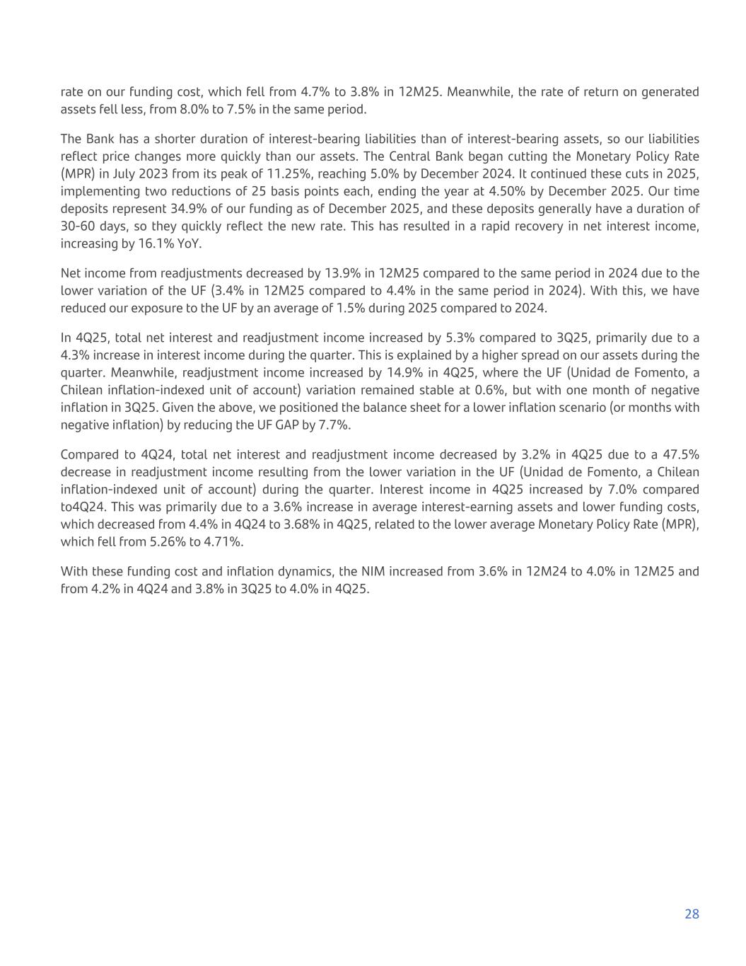 rate on our funding cost, which fell from 4.7% to 3.8% in 12M25. Meanwhile, the rate of return on generated assets fell less, from 8.0% to 7.5% in the same period. The Bank has a shorter duration of interest-bearing liabilities than of interest-bearing assets, so our liabilities reflect price changes more quickly than our assets. The Central Bank began cutting the Monetary Policy Rate (MPR) in July 2023 from its peak of 11.25%, reaching 5.0% by December 2024. It continued these cuts in 2025, implementing two reductions of 25 basis points each, ending the year at 4.50% by December 2025. Our time deposits represent 34.9% of our funding as of December 2025, and these deposits generally have a duration of 30-60 days, so they quickly reflect the new rate. This has resulted in a rapid recovery in net interest income, increasing by 16.1% YoY. Net income from readjustments decreased by 13.9% in 12M25 compared to the same period in 2024 due to the lower variation of the UF (3.4% in 12M25 compared to 4.4% in the same period in 2024). With this, we have reduced our exposure to the UF by an average of 1.5% during 2025 compared to 2024. In 4Q25, total net interest and readjustment income increased by 5.3% compared to 3Q25, primarily due to a 4.3% increase in interest income during the quarter. This is explained by a higher spread on our assets during the quarter. Meanwhile, readjustment income increased by 14.9% in 4Q25, where the UF (Unidad de Fomento, a Chilean inflation-indexed unit of account) variation remained stable at 0.6%, but with one month of negative inflation in 3Q25. Given the above, we positioned the balance sheet for a lower inflation scenario (or months with negative inflation) by reducing the UF GAP by 7.7%. Compared to 4Q24, total net interest and readjustment income decreased by 3.2% in 4Q25 due to a 47.5% decrease in readjustment income resulting from the lower variation in the UF (Unidad de Fomento, a Chilean inflation-indexed unit of account) during the quarter. Interest income in 4Q25 increased by 7.0% compared to4Q24. This was primarily due to a 3.6% increase in average interest-earning assets and lower funding costs, which decreased from 4.4% in 4Q24 to 3.68% in 4Q25, related to the lower average Monetary Policy Rate (MPR), which fell from 5.26% to 4.71%. With these funding cost and inflation dynamics, the NIM increased from 3.6% in 12M24 to 4.0% in 12M25 and from 4.2% in 4Q24 and 3.8% in 3Q25 to 4.0% in 4Q25. 28