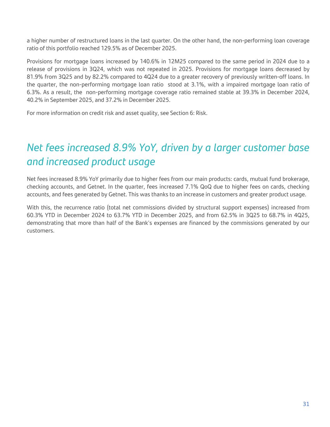 a higher number of restructured loans in the last quarter. On the other hand, the non-performing loan coverage ratio of this portfolio reached 129.5% as of December 2025. Provisions for mortgage loans increased by 140.6% in 12M25 compared to the same period in 2024 due to a release of provisions in 3Q24, which was not repeated in 2025. Provisions for mortgage loans decreased by 81.9% from 3Q25 and by 82.2% compared to 4Q24 due to a greater recovery of previously written-off loans. In the quarter, the non-performing mortgage loan ratio stood at 3.1%, with a impaired mortgage loan ratio of 6.3%. As a result, the non-performing mortgage coverage ratio remained stable at 39.3% in December 2024, 40.2% in September 2025, and 37.2% in December 2025. For more information on credit risk and asset quality, see Section 6: Risk. Net fees increased 8.9% YoY, driven by a larger customer base and increased product usage Net fees increased 8.9% YoY primarily due to higher fees from our main products: cards, mutual fund brokerage, checking accounts, and Getnet. In the quarter, fees increased 7.1% QoQ due to higher fees on cards, checking accounts, and fees generated by Getnet. This was thanks to an increase in customers and greater product usage. With this, the recurrence ratio (total net commissions divided by structural support expenses) increased from 60.3% YTD in December 2024 to 63.7% YTD in December 2025, and from 62.5% in 3Q25 to 68.7% in 4Q25, demonstrating that more than half of the Bank's expenses are financed by the commissions generated by our customers. 31