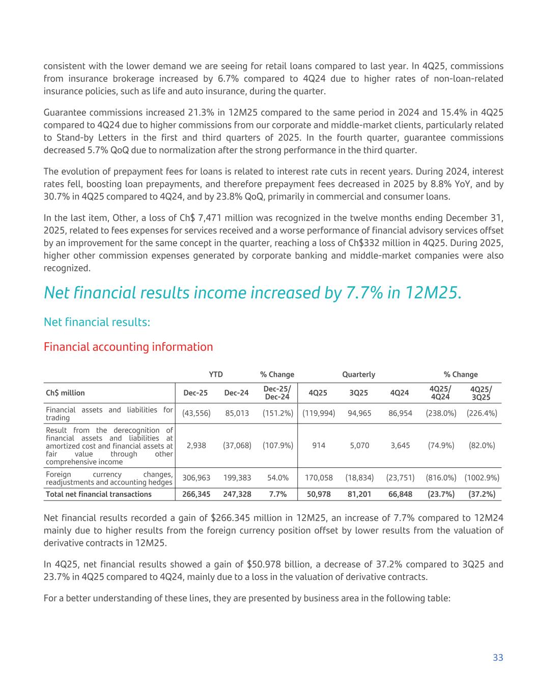 consistent with the lower demand we are seeing for retail loans compared to last year. In 4Q25, commissions from insurance brokerage increased by 6.7% compared to 4Q24 due to higher rates of non-loan-related insurance policies, such as life and auto insurance, during the quarter. Guarantee commissions increased 21.3% in 12M25 compared to the same period in 2024 and 15.4% in 4Q25 compared to 4Q24 due to higher commissions from our corporate and middle-market clients, particularly related to Stand-by Letters in the first and third quarters of 2025. In the fourth quarter, guarantee commissions decreased 5.7% QoQ due to normalization after the strong performance in the third quarter. The evolution of prepayment fees for loans is related to interest rate cuts in recent years. During 2024, interest rates fell, boosting loan prepayments, and therefore prepayment fees decreased in 2025 by 8.8% YoY, and by 30.7% in 4Q25 compared to 4Q24, and by 23.8% QoQ, primarily in commercial and consumer loans. In the last item, Other, a loss of Ch$ 7,471 million was recognized in the twelve months ending December 31, 2025, related to fees expenses for services received and a worse performance of financial advisory services offset by an improvement for the same concept in the quarter, reaching a loss of Ch$332 million in 4Q25. During 2025, higher other commission expenses generated by corporate banking and middle-market companies were also recognized. Net financial results income increased by 7.7% in 12M25. Net financial results: Financial accounting information YTD % Change Quarterly % Change Ch$ million Dec-25 Dec-24 Dec-25/ Dec-24 4Q25 3Q25 4Q24 4Q25/ 4Q24 4Q25/ 3Q25 Financial assets and liabilities for trading (43,556) 85,013 (151.2%) (119,994) 94,965 86,954 (238.0%) (226.4%) Result from the derecognition of financial assets and liabilities at amortized cost and financial assets at fair value through other comprehensive income 2,938 (37,068) (107.9%) 914 5,070 3,645 (74.9%) (82.0%) Foreign currency changes, readjustments and accounting hedges 306,963 199,383 54.0% 170,058 (18,834) (23,751) (816.0%) (1002.9%) Total net financial transactions 266,345 247,328 7.7% 50,978 81,201 66,848 (23.7%) (37.2%) Net financial results recorded a gain of $266.345 million in 12M25, an increase of 7.7% compared to 12M24 mainly due to higher results from the foreign currency position offset by lower results from the valuation of derivative contracts in 12M25. In 4Q25, net financial results showed a gain of $50.978 billion, a decrease of 37.2% compared to 3Q25 and 23.7% in 4Q25 compared to 4Q24, mainly due to a loss in the valuation of derivative contracts. For a better understanding of these lines, they are presented by business area in the following table: 33
