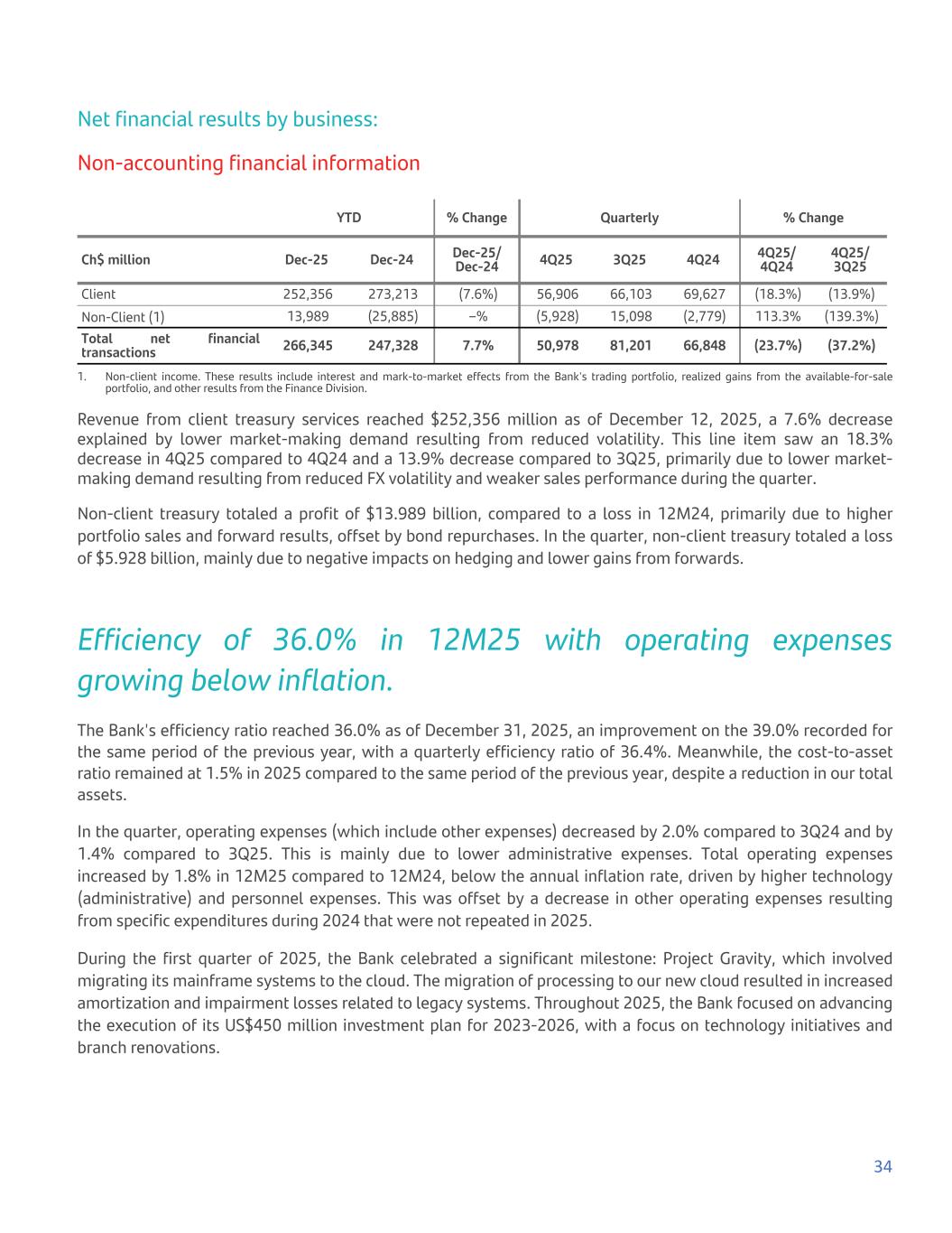 Net financial results by business: Non-accounting financial information YTD % Change Quarterly % Change Ch$ million Dec-25 Dec-24 Dec-25/ Dec-24 4Q25 3Q25 4Q24 4Q25/ 4Q24 4Q25/ 3Q25 Client 252,356 273,213 (7.6%) 56,906 66,103 69,627 (18.3%) (13.9%) Non-Client (1) 13,989 (25,885) –% (5,928) 15,098 (2,779) 113.3% (139.3%) Total net financial transactions 266,345 247,328 7.7% 50,978 81,201 66,848 (23.7%) (37.2%) 1. Non-client income. These results include interest and mark-to-market effects from the Bank's trading portfolio, realized gains from the available-for-sale portfolio, and other results from the Finance Division. Revenue from client treasury services reached $252,356 million as of December 12, 2025, a 7.6% decrease explained by lower market-making demand resulting from reduced volatility. This line item saw an 18.3% decrease in 4Q25 compared to 4Q24 and a 13.9% decrease compared to 3Q25, primarily due to lower market- making demand resulting from reduced FX volatility and weaker sales performance during the quarter. Non-client treasury totaled a profit of $13.989 billion, compared to a loss in 12M24, primarily due to higher portfolio sales and forward results, offset by bond repurchases. In the quarter, non-client treasury totaled a loss of $5.928 billion, mainly due to negative impacts on hedging and lower gains from forwards. Efficiency of 36.0% in 12M25 with operating expenses growing below inflation. The Bank's efficiency ratio reached 36.0% as of December 31, 2025, an improvement on the 39.0% recorded for the same period of the previous year, with a quarterly efficiency ratio of 36.4%. Meanwhile, the cost-to-asset ratio remained at 1.5% in 2025 compared to the same period of the previous year, despite a reduction in our total assets. In the quarter, operating expenses (which include other expenses) decreased by 2.0% compared to 3Q24 and by 1.4% compared to 3Q25. This is mainly due to lower administrative expenses. Total operating expenses increased by 1.8% in 12M25 compared to 12M24, below the annual inflation rate, driven by higher technology (administrative) and personnel expenses. This was offset by a decrease in other operating expenses resulting from specific expenditures during 2024 that were not repeated in 2025. During the first quarter of 2025, the Bank celebrated a significant milestone: Project Gravity, which involved migrating its mainframe systems to the cloud. The migration of processing to our new cloud resulted in increased amortization and impairment losses related to legacy systems. Throughout 2025, the Bank focused on advancing the execution of its US$450 million investment plan for 2023-2026, with a focus on technology initiatives and branch renovations. 34