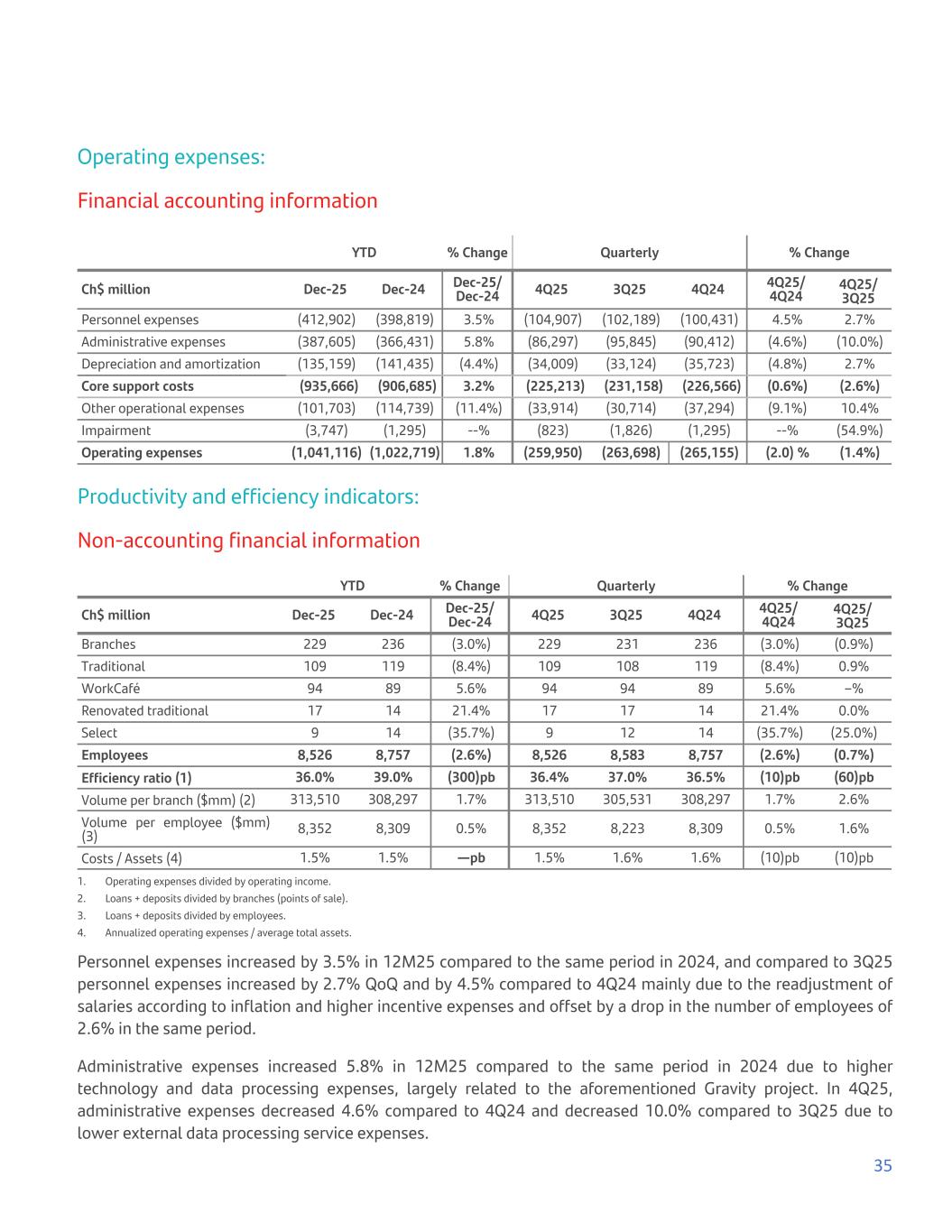 Operating expenses: Financial accounting information YTD % Change Quarterly % Change Ch$ million Dec-25 Dec-24 Dec-25/ Dec-24 4Q25 3Q25 4Q24 4Q25/ 4Q24 4Q25/ 3Q25 Personnel expenses (412,902) (398,819) 3.5% (104,907) (102,189) (100,431) 4.5% 2.7% Administrative expenses (387,605) (366,431) 5.8% (86,297) (95,845) (90,412) (4.6%) (10.0%) Depreciation and amortization (135,159) (141,435) (4.4%) (34,009) (33,124) (35,723) (4.8%) 2.7% Core support costs (935,666) (906,685) 3.2% (225,213) (231,158) (226,566) (0.6%) (2.6%) Other operational expenses (101,703) (114,739) (11.4%) (33,914) (30,714) (37,294) (9.1%) 10.4% Impairment (3,747) (1,295) --% (823) (1,826) (1,295) --% (54.9%) Operating expenses (1,041,116) (1,022,719) 1.8% (259,950) (263,698) (265,155) (2.0) % (1.4%) Productivity and efficiency indicators: Non-accounting financial information YTD % Change Quarterly % Change Ch$ million Dec-25 Dec-24 Dec-25/ Dec-24 4Q25 3Q25 4Q24 4Q25/ 4Q24 4Q25/ 3Q25 Branches 229 236 (3.0%) 229 231 236 (3.0%) (0.9%) Traditional 109 119 (8.4%) 109 108 119 (8.4%) 0.9% WorkCafé 94 89 5.6% 94 94 89 5.6% –% Renovated traditional 17 14 21.4% 17 17 14 21.4% 0.0% Select 9 14 (35.7%) 9 12 14 (35.7%) (25.0%) Employees 8,526 8,757 (2.6%) 8,526 8,583 8,757 (2.6%) (0.7%) Efficiency ratio (1) 36.0% 39.0% (300)pb 36.4% 37.0% 36.5% (10)pb (60)pb Volume per branch ($mm) (2) 313,510 308,297 1.7% 313,510 305,531 308,297 1.7% 2.6% Volume per employee ($mm) (3) 8,352 8,309 0.5% 8,352 8,223 8,309 0.5% 1.6% Costs / Assets (4) 1.5% 1.5% —pb 1.5% 1.6% 1.6% (10)pb (10)pb 1. Operating expenses divided by operating income. 2. Loans + deposits divided by branches (points of sale). 3. Loans + deposits divided by employees. 4. Annualized operating expenses / average total assets. Personnel expenses increased by 3.5% in 12M25 compared to the same period in 2024, and compared to 3Q25 personnel expenses increased by 2.7% QoQ and by 4.5% compared to 4Q24 mainly due to the readjustment of salaries according to inflation and higher incentive expenses and offset by a drop in the number of employees of 2.6% in the same period. Administrative expenses increased 5.8% in 12M25 compared to the same period in 2024 due to higher technology and data processing expenses, largely related to the aforementioned Gravity project. In 4Q25, administrative expenses decreased 4.6% compared to 4Q24 and decreased 10.0% compared to 3Q25 due to lower external data processing service expenses. 35