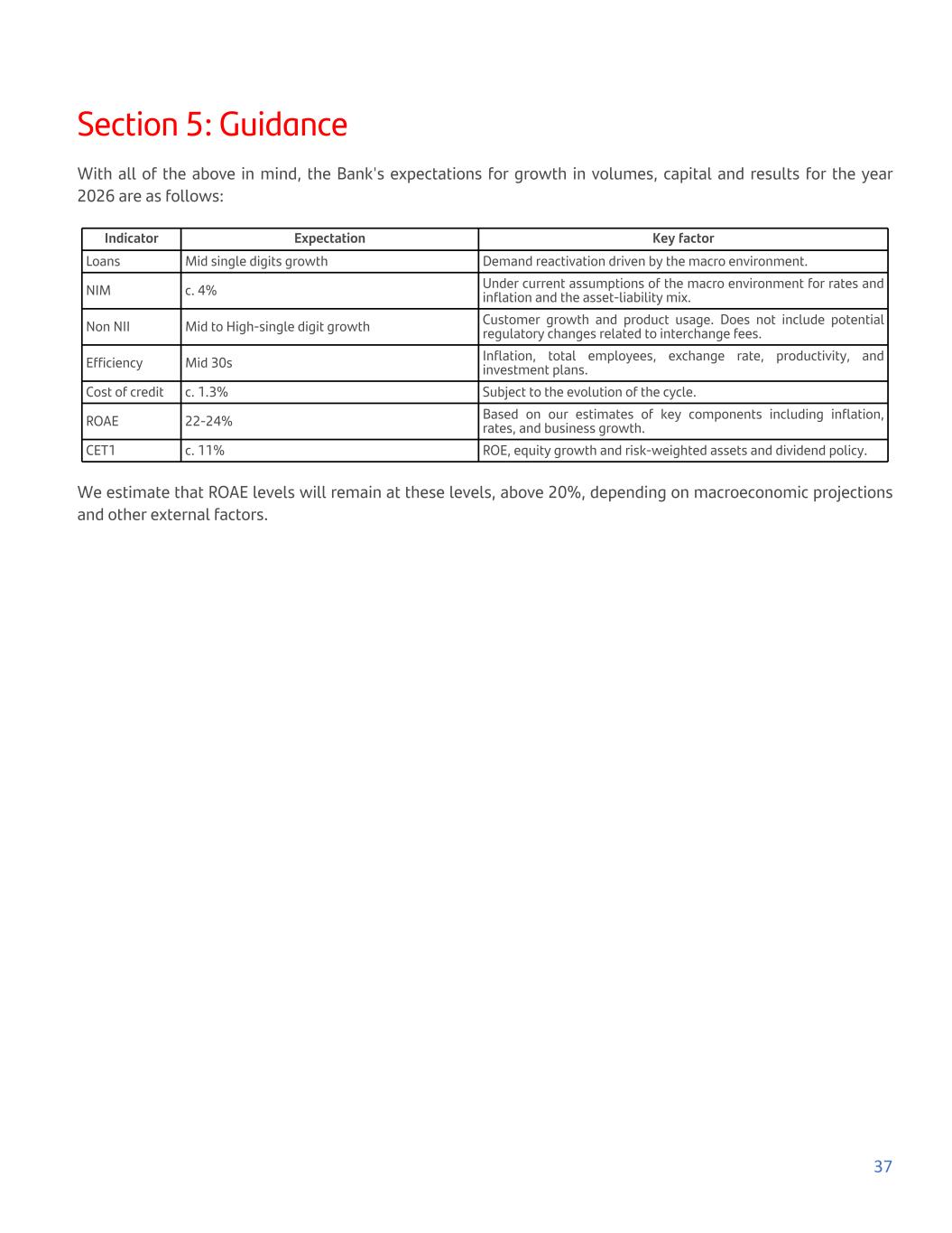Section 5: Guidance With all of the above in mind, the Bank's expectations for growth in volumes, capital and results for the year 2026 are as follows: Indicator Expectation Key factor Loans Mid single digits growth Demand reactivation driven by the macro environment. NIM c. 4% Under current assumptions of the macro environment for rates and inflation and the asset-liability mix. Non NII Mid to High-single digit growth Customer growth and product usage. Does not include potential regulatory changes related to interchange fees. Efficiency Mid 30s Inflation, total employees, exchange rate, productivity, and investment plans. Cost of credit c. 1.3% Subject to the evolution of the cycle. ROAE 22-24% Based on our estimates of key components including inflation, rates, and business growth. CET1 c. 11% ROE, equity growth and risk-weighted assets and dividend policy. We estimate that ROAE levels will remain at these levels, above 20%, depending on macroeconomic projections and other external factors. 37