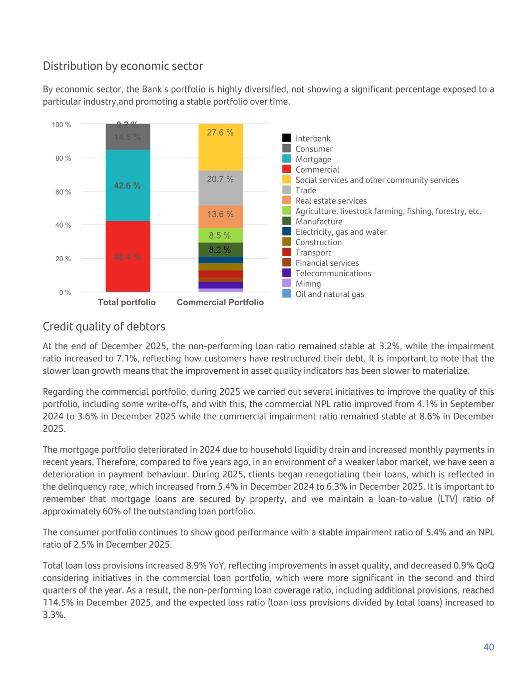Distribution by economic sector By economic sector, the Bank's portfolio is highly diversified, not showing a significant percentage exposed to a particular industry,and promoting a stable portfolio over time. 8.2 % 8.5 % 13.6 % 20.7 % 27.6 % 42.4 % 42.6 % 14.8 % 0.2 % Interbank Consumer Mortgage Commercial Social services and other community services Trade Real estate services Agriculture, livestock farming, fishing, forestry, etc. Manufacture Electricity, gas and water Construction Transport Financial services Telecommunications Mining Oil and natural gas Total portfolio Commercial Portfolio 0 % 20 % 40 % 60 % 80 % 100 % Credit quality of debtors At the end of December 2025, the non-performing loan ratio remained stable at 3.2%, while the impairment ratio increased to 7.1%, reflecting how customers have restructured their debt. It is important to note that the slower loan growth means that the improvement in asset quality indicators has been slower to materialize. Regarding the commercial portfolio, during 2025 we carried out several initiatives to improve the quality of this portfolio, including some write-offs, and with this, the commercial NPL ratio improved from 4.1% in September 2024 to 3.6% in December 2025 while the commercial impairment ratio remained stable at 8.6% in December 2025. The mortgage portfolio deteriorated in 2024 due to household liquidity drain and increased monthly payments in recent years. Therefore, compared to five years ago, in an environment of a weaker labor market, we have seen a deterioration in payment behaviour. During 2025, clients began renegotiating their loans, which is reflected in the delinquency rate, which increased from 5.4% in December 2024 to 6.3% in December 2025. It is important to remember that mortgage loans are secured by property, and we maintain a loan-to-value (LTV) ratio of approximately 60% of the outstanding loan portfolio. The consumer portfolio continues to show good performance with a stable impairment ratio of 5.4% and an NPL ratio of 2.5% in December 2025. Total loan loss provisions increased 8.9% YoY, reflecting improvements in asset quality, and decreased 0.9% QoQ considering initiatives in the commercial loan portfolio, which were more significant in the second and third quarters of the year. As a result, the non-performing loan coverage ratio, including additional provisions, reached 114.5% in December 2025, and the expected loss ratio (loan loss provisions divided by total loans) increased to 3.3%. 40