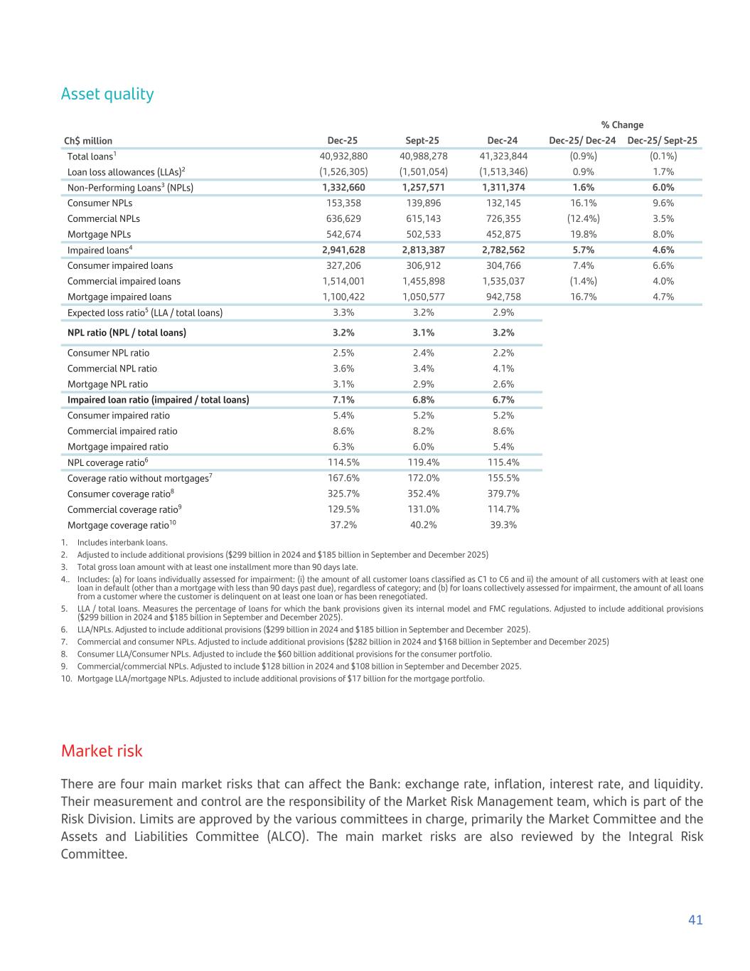 Asset quality % Change Ch$ million Dec-25 Sept-25 Dec-24 Dec-25/ Dec-24 Dec-25/ Sept-25 Total loans1 40,932,880 40,988,278 41,323,844 (0.9%) (0.1%) Loan loss allowances (LLAs)2 (1,526,305) (1,501,054) (1,513,346) 0.9% 1.7% Non-Performing Loans3 (NPLs) 1,332,660 1,257,571 1,311,374 1.6% 6.0% Consumer NPLs 153,358 139,896 132,145 16.1% 9.6% Commercial NPLs 636,629 615,143 726,355 (12.4%) 3.5% Mortgage NPLs 542,674 502,533 452,875 19.8% 8.0% Impaired loans4 2,941,628 2,813,387 2,782,562 5.7% 4.6% Consumer impaired loans 327,206 306,912 304,766 7.4% 6.6% Commercial impaired loans 1,514,001 1,455,898 1,535,037 (1.4%) 4.0% Mortgage impaired loans 1,100,422 1,050,577 942,758 16.7% 4.7% Expected loss ratio5 (LLA / total loans) 3.3% 3.2% 2.9% NPL ratio (NPL / total loans) 3.2% 3.1% 3.2% Consumer NPL ratio 2.5% 2.4% 2.2% Commercial NPL ratio 3.6% 3.4% 4.1% Mortgage NPL ratio 3.1% 2.9% 2.6% Impaired loan ratio (impaired / total loans) 7.1% 6.8% 6.7% Consumer impaired ratio 5.4% 5.2% 5.2% Commercial impaired ratio 8.6% 8.2% 8.6% Mortgage impaired ratio 6.3% 6.0% 5.4% NPL coverage ratio6 114.5% 119.4% 115.4% Coverage ratio without mortgages7 167.6% 172.0% 155.5% Consumer coverage ratio8 325.7% 352.4% 379.7% Commercial coverage ratio9 129.5% 131.0% 114.7% Mortgage coverage ratio10 37.2% 40.2% 39.3% 1. Includes interbank loans. 2. Adjusted to include additional provisions ($299 billion in 2024 and $185 billion in September and December 2025) 3. Total gross loan amount with at least one installment more than 90 days late. 4.. Includes: (a) for loans individually assessed for impairment: (i) the amount of all customer loans classified as C1 to C6 and ii) the amount of all customers with at least one loan in default (other than a mortgage with less than 90 days past due), regardless of category; and (b) for loans collectively assessed for impairment, the amount of all loans from a customer where the customer is delinquent on at least one loan or has been renegotiated. 5. LLA / total loans. Measures the percentage of loans for which the bank provisions given its internal model and FMC regulations. Adjusted to include additional provisions ($299 billion in 2024 and $185 billion in September and December 2025). 6. LLA/NPLs. Adjusted to include additional provisions ($299 billion in 2024 and $185 billion in September and December 2025). 7. Commercial and consumer NPLs. Adjusted to include additional provisions ($282 billion in 2024 and $168 billion in September and December 2025) 8. Consumer LLA/Consumer NPLs. Adjusted to include the $60 billion additional provisions for the consumer portfolio. 9. Commercial/commercial NPLs. Adjusted to include $128 billion in 2024 and $108 billion in September and December 2025. 10. Mortgage LLA/mortgage NPLs. Adjusted to include additional provisions of $17 billion for the mortgage portfolio. Market risk There are four main market risks that can affect the Bank: exchange rate, inflation, interest rate, and liquidity. Their measurement and control are the responsibility of the Market Risk Management team, which is part of the Risk Division. Limits are approved by the various committees in charge, primarily the Market Committee and the Assets and Liabilities Committee (ALCO). The main market risks are also reviewed by the Integral Risk Committee. 41