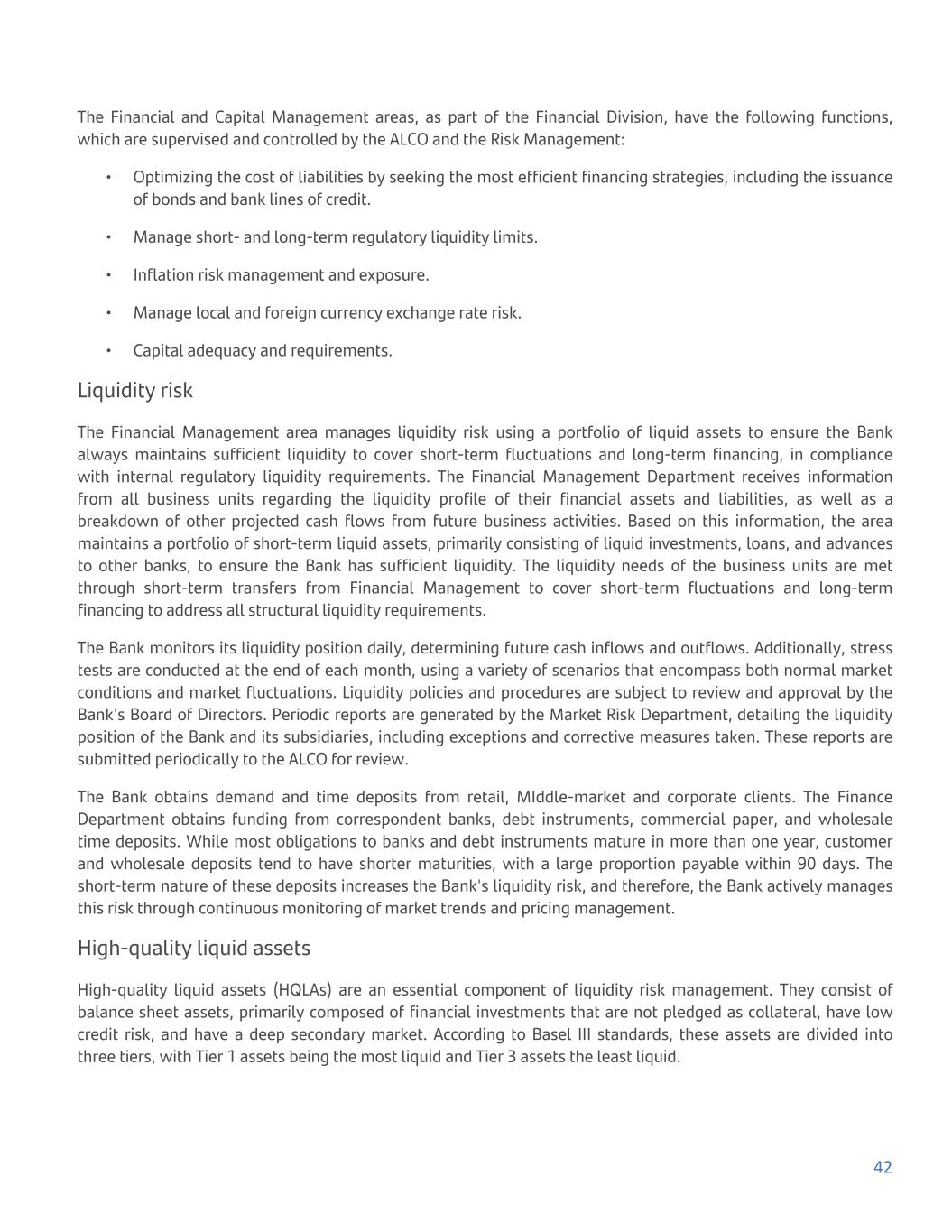 The Financial and Capital Management areas, as part of the Financial Division, have the following functions, which are supervised and controlled by the ALCO and the Risk Management: • Optimizing the cost of liabilities by seeking the most efficient financing strategies, including the issuance of bonds and bank lines of credit. • Manage short- and long-term regulatory liquidity limits. • Inflation risk management and exposure. • Manage local and foreign currency exchange rate risk. • Capital adequacy and requirements. Liquidity risk The Financial Management area manages liquidity risk using a portfolio of liquid assets to ensure the Bank always maintains sufficient liquidity to cover short-term fluctuations and long-term financing, in compliance with internal regulatory liquidity requirements. The Financial Management Department receives information from all business units regarding the liquidity profile of their financial assets and liabilities, as well as a breakdown of other projected cash flows from future business activities. Based on this information, the area maintains a portfolio of short-term liquid assets, primarily consisting of liquid investments, loans, and advances to other banks, to ensure the Bank has sufficient liquidity. The liquidity needs of the business units are met through short-term transfers from Financial Management to cover short-term fluctuations and long-term financing to address all structural liquidity requirements. The Bank monitors its liquidity position daily, determining future cash inflows and outflows. Additionally, stress tests are conducted at the end of each month, using a variety of scenarios that encompass both normal market conditions and market fluctuations. Liquidity policies and procedures are subject to review and approval by the Bank's Board of Directors. Periodic reports are generated by the Market Risk Department, detailing the liquidity position of the Bank and its subsidiaries, including exceptions and corrective measures taken. These reports are submitted periodically to the ALCO for review. The Bank obtains demand and time deposits from retail, MIddle-market and corporate clients. The Finance Department obtains funding from correspondent banks, debt instruments, commercial paper, and wholesale time deposits. While most obligations to banks and debt instruments mature in more than one year, customer and wholesale deposits tend to have shorter maturities, with a large proportion payable within 90 days. The short-term nature of these deposits increases the Bank's liquidity risk, and therefore, the Bank actively manages this risk through continuous monitoring of market trends and pricing management. High-quality liquid assets High-quality liquid assets (HQLAs) are an essential component of liquidity risk management. They consist of balance sheet assets, primarily composed of financial investments that are not pledged as collateral, have low credit risk, and have a deep secondary market. According to Basel III standards, these assets are divided into three tiers, with Tier 1 assets being the most liquid and Tier 3 assets the least liquid. 42