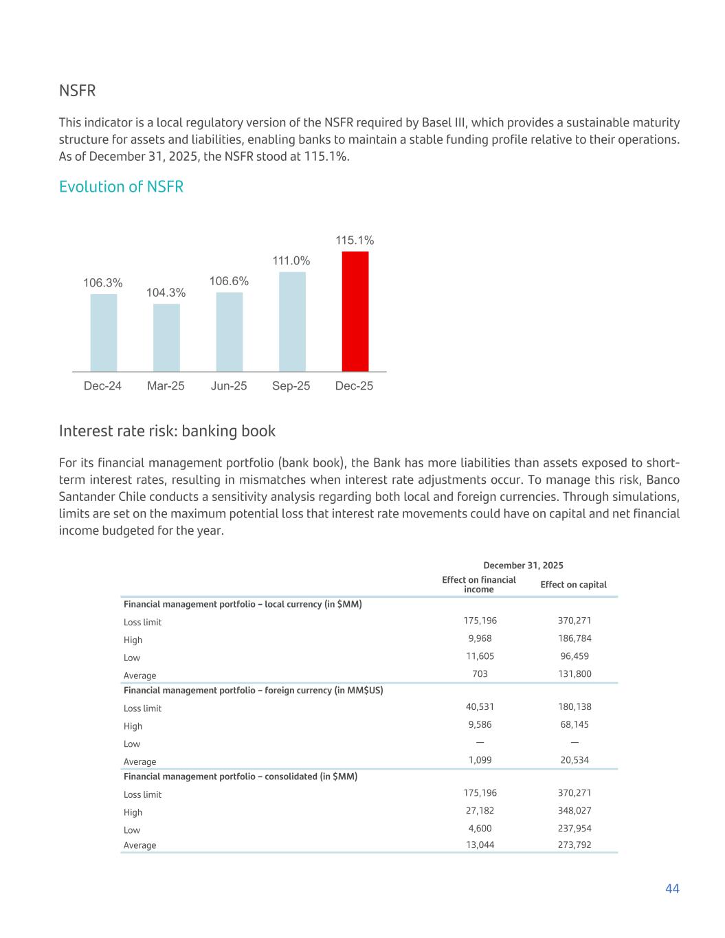 NSFR This indicator is a local regulatory version of the NSFR required by Basel III, which provides a sustainable maturity structure for assets and liabilities, enabling banks to maintain a stable funding profile relative to their operations. As of December 31, 2025, the NSFR stood at 115.1%. Evolution of NSFR 106.3% 104.3% 106.6% 111.0% 115.1% Dec-24 Mar-25 Jun-25 Sep-25 Dec-25 Interest rate risk: banking book For its financial management portfolio (bank book), the Bank has more liabilities than assets exposed to short- term interest rates, resulting in mismatches when interest rate adjustments occur. To manage this risk, Banco Santander Chile conducts a sensitivity analysis regarding both local and foreign currencies. Through simulations, limits are set on the maximum potential loss that interest rate movements could have on capital and net financial income budgeted for the year. December 31, 2025 Effect on financial income Effect on capital Financial management portfolio – local currency (in $MM) Loss limit 175,196 370,271 High 9,968 186,784 Low 11,605 96,459 Average 703 131,800 Financial management portfolio – foreign currency (in MM$US) Loss limit 40,531 180,138 High 9,586 68,145 Low — — Average 1,099 20,534 Financial management portfolio – consolidated (in $MM) Loss limit 175,196 370,271 High 27,182 348,027 Low 4,600 237,954 Average 13,044 273,792 44