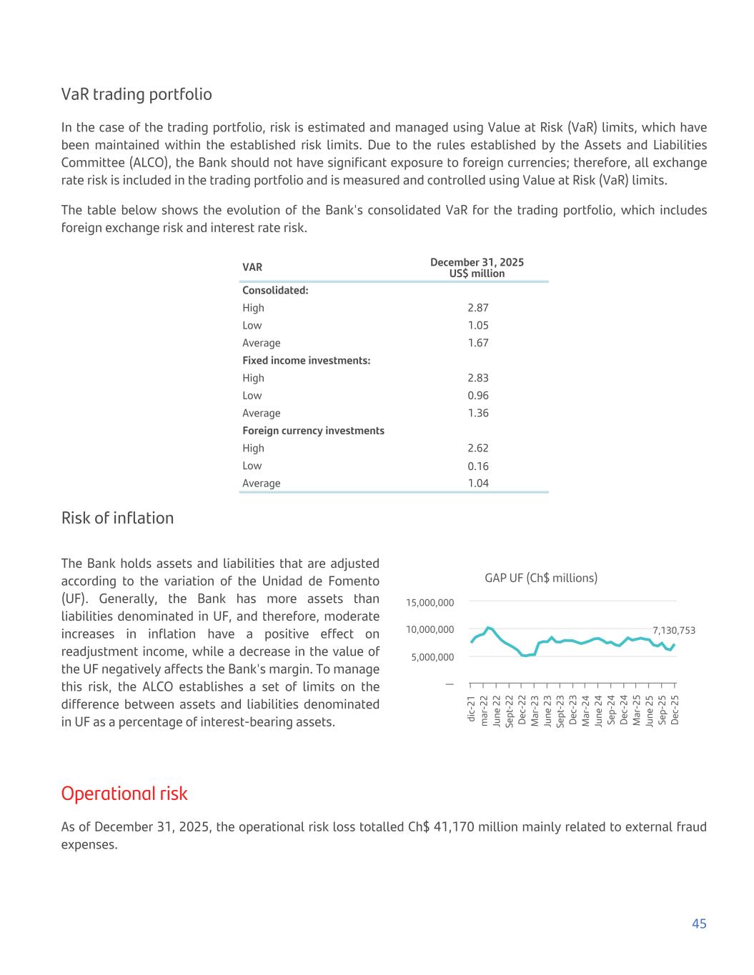 VaR trading portfolio In the case of the trading portfolio, risk is estimated and managed using Value at Risk (VaR) limits, which have been maintained within the established risk limits. Due to the rules established by the Assets and Liabilities Committee (ALCO), the Bank should not have significant exposure to foreign currencies; therefore, all exchange rate risk is included in the trading portfolio and is measured and controlled using Value at Risk (VaR) limits. The table below shows the evolution of the Bank's consolidated VaR for the trading portfolio, which includes foreign exchange risk and interest rate risk. VAR December 31, 2025 US$ million Consolidated: High 2.87 Low 1.05 Average 1.67 Fixed income investments: High 2.83 Low 0.96 Average 1.36 Foreign currency investments High 2.62 Low 0.16 Average 1.04 Risk of inflation The Bank holds assets and liabilities that are adjusted according to the variation of the Unidad de Fomento (UF). Generally, the Bank has more assets than liabilities denominated in UF, and therefore, moderate increases in inflation have a positive effect on readjustment income, while a decrease in the value of the UF negatively affects the Bank's margin. To manage this risk, the ALCO establishes a set of limits on the difference between assets and liabilities denominated in UF as a percentage of interest-bearing assets. GAP UF (Ch$ millions) 7,130,753 di c- 21 m ar -2 2 Ju ne 2 2 Se pt -2 2 De c- 22 M ar -2 3 Ju ne 2 3 Se pt -2 3 De c- 23 M ar -2 4 Ju ne 2 4 Se p- 24 De c- 24 M ar -2 5 Ju ne 2 5 Se p- 25 De c- 25 — 5,000,000 10,000,000 15,000,000 Operational risk As of December 31, 2025, the operational risk loss totalled Ch$ 41,170 million mainly related to external fraud expenses. 45