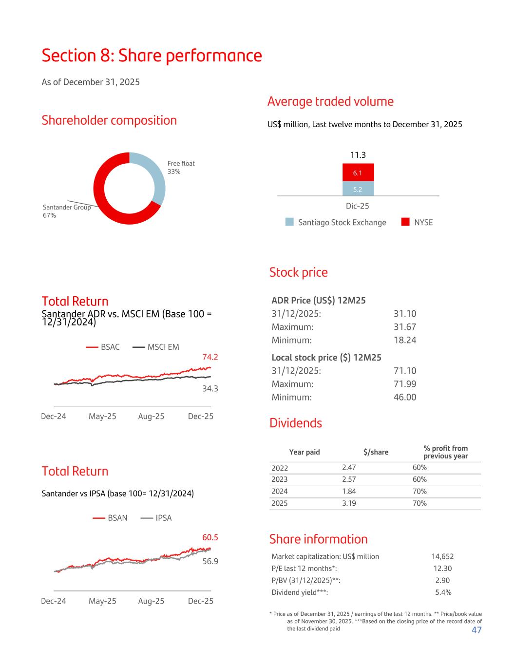 Section 8: Share performance As of December 31, 2025 Shareholder composition Free float 33% Santander Group 67% Average traded volume US$ million, Last twelve months to December 31, 2025 11.3 5.2 6.1 Santiago Stock Exchange NYSE Dic-25 Total Return Santander ADR vs. MSCI EM (Base 100 = 12/31/2024) 74.2 34.3 BSAC MSCI EM Dec-24 May-25 Aug-25 Dec-25 Total Return Santander vs IPSA (base 100= 12/31/2024) 60.5 56.9 BSAN IPSA Dec-24 May-25 Aug-25 Dec-25 Stock price ADR Price (US$) 12M25 31/12/2025: 31.10 Maximum: 31.67 Minimum: 18.24 Local stock price ($) 12M25 31/12/2025: 71.10 Maximum: 71.99 Minimum: 46.00 Dividends Year paid $/share % profit from previous year 2022 2.47 60% 2023 2.57 60% 2024 1.84 70% 2025 3.19 70% Share information Market capitalization: US$ million 14,652 P/E last 12 months*: 12.30 P/BV (31/12/2025)**: 2.90 Dividend yield***: 5.4% * Price as of December 31, 2025 / earnings of the last 12 months. ** Price/book value as of November 30, 2025. ***Based on the closing price of the record date of the last dividend paid 47