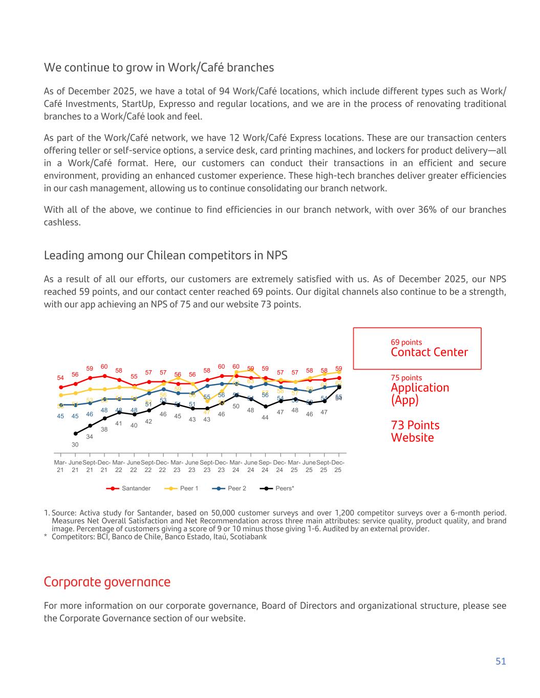 We continue to grow in Work/Café branches As of December 2025, we have a total of 94 Work/Café locations, which include different types such as Work/ Café Investments, StartUp, Expresso and regular locations, and we are in the process of renovating traditional branches to a Work/Café look and feel. As part of the Work/Café network, we have 12 Work/Café Express locations. These are our transaction centers offering teller or self-service options, a service desk, card printing machines, and lockers for product delivery—all in a Work/Café format. Here, our customers can conduct their transactions in an efficient and secure environment, providing an enhanced customer experience. These high-tech branches deliver greater efficiencies in our cash management, allowing us to continue consolidating our branch network. With all of the above, we continue to find efficiencies in our branch network, with over 36% of our branches cashless. Leading among our Chilean competitors in NPS As a result of all our efforts, our customers are extremely satisfied with us. As of December 2025, our NPS reached 59 points, and our contact center reached 69 points. Our digital channels also continue to be a strength, with our app achieving an NPS of 75 and our website 73 points. 54 56 59 60 58 55 57 57 56 56 58 60 60 59 59 57 57 58 58 59 50 51 53 53 54 54 52 56 59 56 47 52 62 63 57 58 57 59 61 62 45 45 46 48 48 48 51 53 51 51 55 56 56 54 56 54 53 52 54 55 30 34 38 41 40 42 46 45 43 43 46 50 48 44 47 48 46 47 54 Santander Peer 1 Peer 2 Peers* Mar- 21 June 21 Sept- 21 Dec- 21 Mar- 22 June 22 Sept- 22 Dec- 22 Mar- 23 June 23 Sept- 23 Dec- 23 Mar- 24 June 24 Sep- 24 Dec- 24 Mar- 25 June 25 Sept- 25 Dec- 25 69 points Contact Center 75 points Application (App) 73 Points Website 1. Source: Activa study for Santander, based on 50,000 customer surveys and over 1,200 competitor surveys over a 6-month period. Measures Net Overall Satisfaction and Net Recommendation across three main attributes: service quality, product quality, and brand image. Percentage of customers giving a score of 9 or 10 minus those giving 1-6. Audited by an external provider. * Competitors: BCI, Banco de Chile, Banco Estado, Itaú, Scotiabank Corporate governance For more information on our corporate governance, Board of Directors and organizational structure, please see the Corporate Governance section of our website. 51