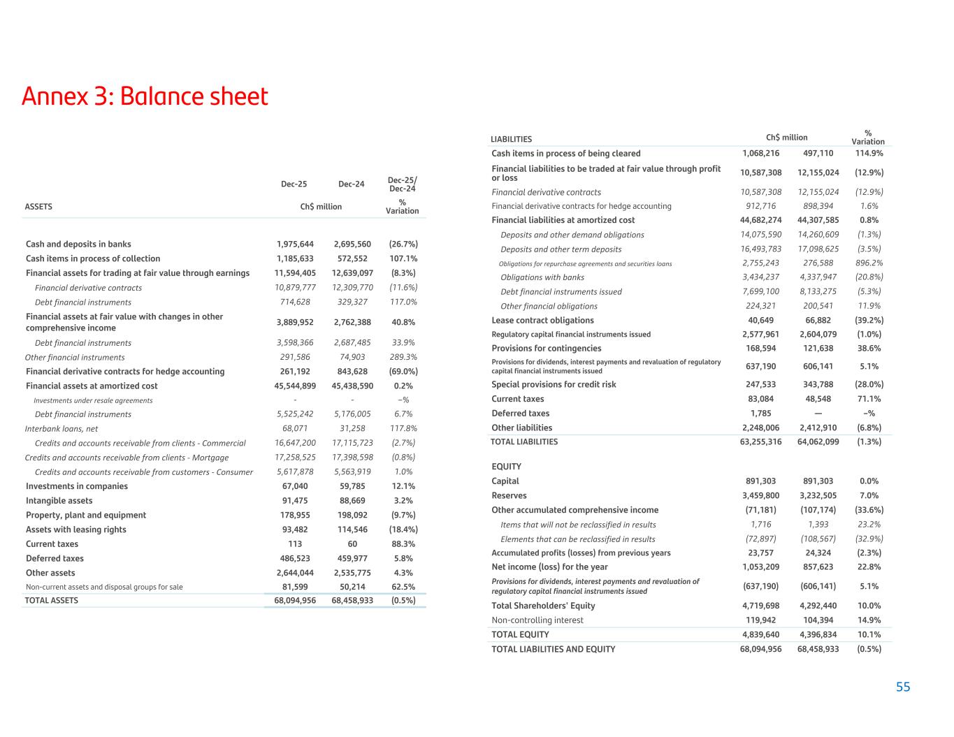 Annex 3: Balance sheet Dec-25 Dec-24 Dec-25/ Dec-24 ASSETS Ch$ million % Variation Cash and deposits in banks 1,975,644 2,695,560 (26.7%) Cash items in process of collection 1,185,633 572,552 107.1% Financial assets for trading at fair value through earnings 11,594,405 12,639,097 (8.3%) Financial derivative contracts 10,879,777 12,309,770 (11.6%) Debt financial instruments 714,628 329,327 117.0% Financial assets at fair value with changes in other comprehensive income 3,889,952 2,762,388 40.8% Debt financial instruments 3,598,366 2,687,485 33.9% Other financial instruments 291,586 74,903 289.3% Financial derivative contracts for hedge accounting 261,192 843,628 (69.0%) Financial assets at amortized cost 45,544,899 45,438,590 0.2% Investments under resale agreements - - –% Debt financial instruments 5,525,242 5,176,005 6.7% Interbank loans, net 68,071 31,258 117.8% Credits and accounts receivable from clients - Commercial 16,647,200 17,115,723 (2.7%) Credits and accounts receivable from clients - Mortgage 17,258,525 17,398,598 (0.8%) Credits and accounts receivable from customers - Consumer 5,617,878 5,563,919 1.0% Investments in companies 67,040 59,785 12.1% Intangible assets 91,475 88,669 3.2% Property, plant and equipment 178,955 198,092 (9.7%) Assets with leasing rights 93,482 114,546 (18.4%) Current taxes 113 60 88.3% Deferred taxes 486,523 459,977 5.8% Other assets 2,644,044 2,535,775 4.3% Non-current assets and disposal groups for sale 81,599 50,214 62.5% TOTAL ASSETS 68,094,956 68,458,933 (0.5%) LIABILITIES Ch$ million % Variation Cash items in process of being cleared 1,068,216 497,110 114.9% Financial liabilities to be traded at fair value through profit or loss 10,587,308 12,155,024 (12.9%) Financial derivative contracts 10,587,308 12,155,024 (12.9%) Financial derivative contracts for hedge accounting 912,716 898,394 1.6% Financial liabilities at amortized cost 44,682,274 44,307,585 0.8% Deposits and other demand obligations 14,075,590 14,260,609 (1.3%) Deposits and other term deposits 16,493,783 17,098,625 (3.5%) Obligations for repurchase agreements and securities loans 2,755,243 276,588 896.2% Obligations with banks 3,434,237 4,337,947 (20.8%) Debt financial instruments issued 7,699,100 8,133,275 (5.3%) Other financial obligations 224,321 200,541 11.9% Lease contract obligations 40,649 66,882 (39.2%) Regulatory capital financial instruments issued 2,577,961 2,604,079 (1.0%) Provisions for contingencies 168,594 121,638 38.6% Provisions for dividends, interest payments and revaluation of regulatory capital financial instruments issued 637,190 606,141 5.1% Special provisions for credit risk 247,533 343,788 (28.0%) Current taxes 83,084 48,548 71.1% Deferred taxes 1,785 — –% Other liabilities 2,248,006 2,412,910 (6.8%) TOTAL LIABILITIES 63,255,316 64,062,099 (1.3%) EQUITY Capital 891,303 891,303 0.0% Reserves 3,459,800 3,232,505 7.0% Other accumulated comprehensive income (71,181) (107,174) (33.6%) Items that will not be reclassified in results 1,716 1,393 23.2% Elements that can be reclassified in results (72,897) (108,567) (32.9%) Accumulated profits (losses) from previous years 23,757 24,324 (2.3%) Net income (loss) for the year 1,053,209 857,623 22.8% Provisions for dividends, interest payments and revaluation of regulatory capital financial instruments issued (637,190) (606,141) 5.1% Total Shareholders' Equity 4,719,698 4,292,440 10.0% Non-controlling interest 119,942 104,394 14.9% TOTAL EQUITY 4,839,640 4,396,834 10.1% TOTAL LIABILITIES AND EQUITY 68,094,956 68,458,933 (0.5%) 55