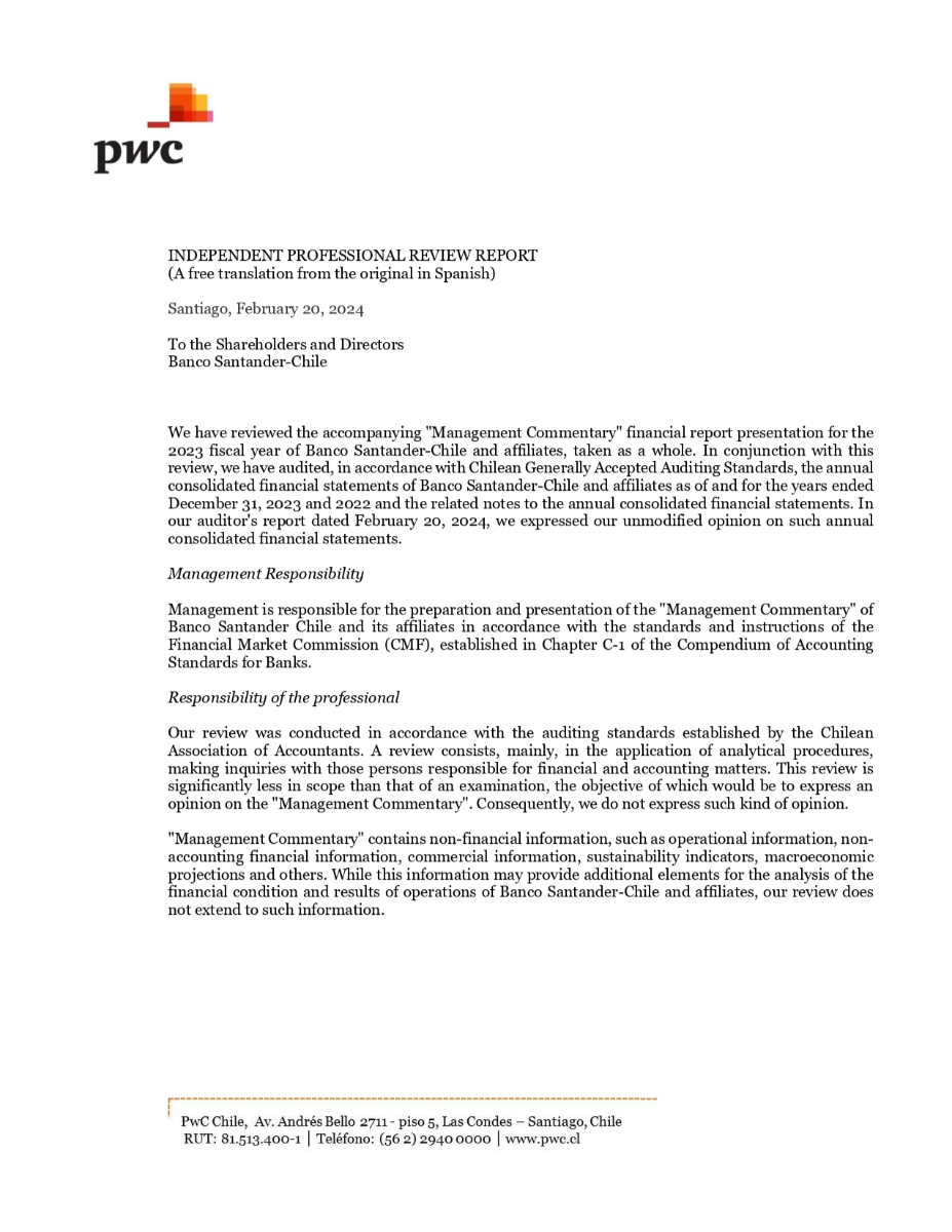 INDEPENDENT PROFESSIONAL REVIEW REPORT (A free translation from the original in Spanish) Santiago, February 20, 2024 To the Shareholders and Directors Banco Santander - Chile We have reviewed the accompanying "Management Commentary" financial report presentation for the 2023 fiscal year of Banco Santander - Chile and affiliates, taken as a whole . In conjunction with this review, we have audited, in accordance with Chilean Generally Accepted Auditing Standards, the annual consolidated financial statements of Banco Santander - Chile and affiliates as of and for the years ended December 31 , 2023 and 2022 and the related notes to the annual consolidated financial statements . In our auditor's report dated February 20 , 2024 , we expressed our unmodified opinion on such annual consolidated financial statements . Management Responsibility Management is responsible for the preparation and presentation of the "Management Commentary" of Banco Santander Chile and its affiliates in accordance with the standards and instructions of the Financial Market Commission (CMF), established in Chapter C - 1 of the Compendium of Accounting Standards for Banks . Responsibility of the professional Our review was conducted in accordance with the auditing standards established by the Chilean Association of Accountants . A review consists, mainly, in the application of analytical procedures, making inquiries with those persons responsible for financial and accounting matters . This review is significantly less in scope than that of an examination, the objective of which would be to express an opinion on the "Management Commentary" . Consequently, we do not express such kind of opinion . "Management Commentary" contains non - financial information, such as operational information, non - accounting financial information, commercial information, sustainability indicators, macroeconomic projections and others . While this information may provide additional elements for the analysis of the financial condition and results of operations of Banco Santander - Chile and affiliates, our review does not extend to such information .