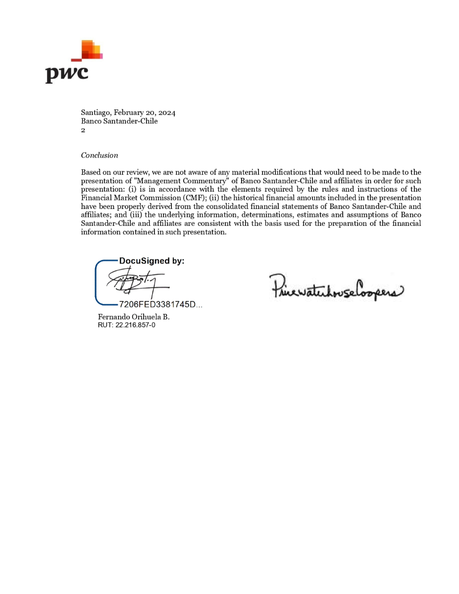 Santiago, February 20, 2024 Banco Santander - Chile 2 Conclusion Based on our review, we are not aware of any material modifications that would need to be made to the presentation of "Management Commentary" of Banco Santander - Chile and affiliates in order for such presentation : (i) is in accordance with the elements required by the rules and instructions of the Financial Market Commission (CMF) ; (ii) the historical financial amounts included in the presentation have been properly derived from the consolidated financial statements of Banco Santander - Chile and affiliates ; and (iii) the underlying information, determinations, estimates and assumptions of Banco Santander - Chile and affiliates are consistent with the basis used for the preparation of the financial information contained in such presentation . Fernando Orihuela B. RUT: 22.216.857 - 0