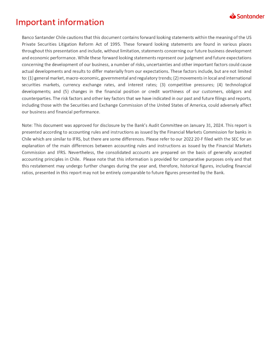 Important information Banco Santander Chile cautions that this document contains forward looking statements within the meaning of the US Private Securities Litigation Reform Act of 1995 . These forward looking statements are found in various places throughout this presentation and include, without limitation, statements concerning our future business development and economic performance . While these forward looking statements represent our judgment and future expectations concerning the development of our business, a number of risks, uncertainties and other important factors could cause actual developments and results to differ materially from our expectations . These factors include, but are not limited to : ( 1 ) general market, macro - economic, governmental and regulatory trends ; ( 2 ) movements in local and international securities markets, currency exchange rates, and interest rates ; ( 3 ) competitive pressures ; ( 4 ) technological developments ; and ( 5 ) changes in the financial position or credit worthiness of our customers, obligors and counterparties . The risk factors and other key factors that we have indicated in our past and future filings and reports, including those with the Securities and Exchange Commission of the United States of America, could adversely affect our business and financial performance . Note : This document was approved for disclosure by the Bank’s Audit Committee on January 31 , 2024 . This report is presented according to accounting rules and instructions as issued by the Financial Markets Commission for banks in Chile which are similar to IFRS, but there are some differences . Please refer to our 2022 20 - F filed with the SEC for an explanation of the main differences between accounting rules and instructions as issued by the Financial Markets Commission and IFRS . Nevertheless, the consolidated accounts are prepared on the basis of generally accepted accounting principles in Chile . Please note that this information is provided for comparative purposes only and that this restatement may undergo further changes during the year and, therefore, historical figures, including financial ratios, presented in this report may not be entirely comparable to future figures presented by the Bank .