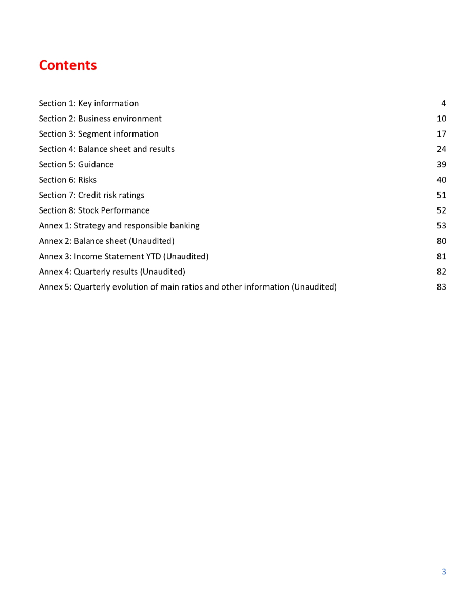 3 Contents Section 1: Key information Section 2: Business environment Section 3: Segment information Section 4: Balance sheet and results Section 5: Guidance Section 6: Risks Section 7: Credit risk ratings Section 8: Stock Performance Annex 1: Strategy and responsible banking Annex 2: Balance sheet (Unaudited) Annex 3: Income Statement YTD (Unaudited) Annex 4: Quarterly results (Unaudited) Annex 5: Quarterly evolution of main ratios and other information (Unaudited) 4 1 0 17 24 39 40 5 1 52 5 3 80 81 82 8 3