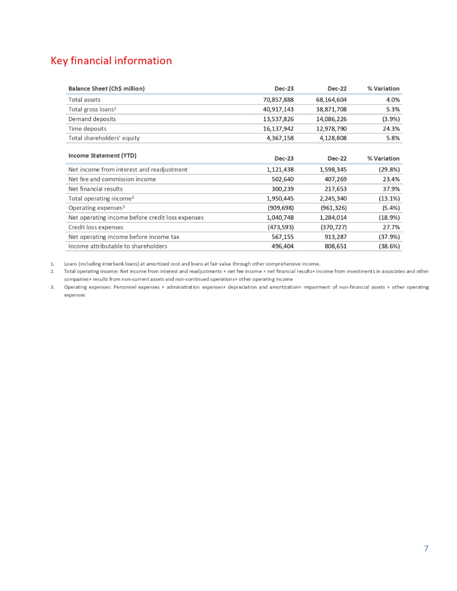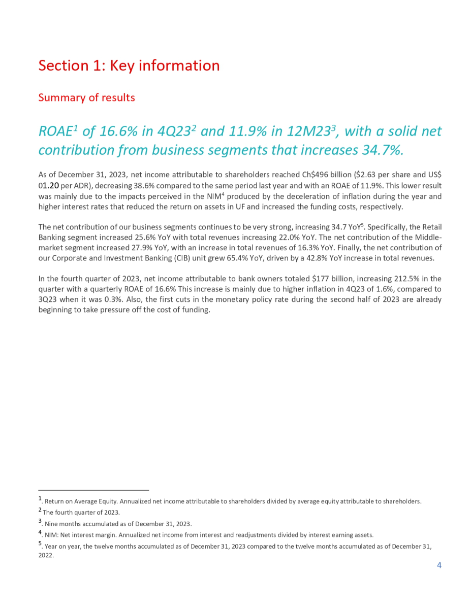 Section 1: Key information Summary of results ROAE 1 of 16 . 6 % in 4 Q 23 2 and 11 . 9 % in 12 M 23 3 , with a solid net contribution from business segments that increases 34 . 7 % . As of December 31 , 2023 , net income attributable to shareholders reached Ch $ 496 billion ( $ 2 . 63 per share and US $ 0 1 . 20 per ADR), decreasing 38 . 6 % compared to the same period last year and with an ROAE of 11 . 9 % . This lower result was mainly due to the impacts perceived in the NIM 4 produced by the deceleration of inflation during the year and higher interest rates that reduced the return on assets in UF and increased the funding costs, respectively . The net contribution of our business segments continues to be very strong, increasing 34 . 7 YoY 5 . Specifically, the Retail Banking segment increased 25 . 6 % YoY with total revenues increasing 22 . 0 % YoY . The net contribution of the Middle - market segment increased 27 . 9 % YoY, with an increase in total revenues of 16 . 3 % YoY . Finally, the net contribution of our Corporate and Investment Banking (CIB) unit grew 65 . 4 % YoY, driven by a 42 . 8 % YoY increase in total revenues . In the fourth quarter of 2023 , net income attributable to bank owners totaled $ 177 billion, increasing 212 . 5 % in the quarter with a quarterly ROAE of 16 . 6 % This increase is mainly due to higher inflation in 4 Q 23 of 1 . 6 % , compared to 3 Q 23 when it was 0 . 3 % . Also, the first cuts in the monetary policy rate during the second half of 2023 are already beginning to take pressure off the cost of funding . 1 . Return on Average Equity. Annualized net income attributable to shareholders divided by average equity attributable to shareholders. 2 The fourth quarter of 2023. 3. Nine months accumulated as of December 31, 2023. 4. NIM: Net interest margin. Annualized net income from interest and readjustments divided by interest earning assets. 5. Year on year, the twelve months accumulated as of December 31, 2023 compared to the twelve months accumulated as of December 31, 2022. 4