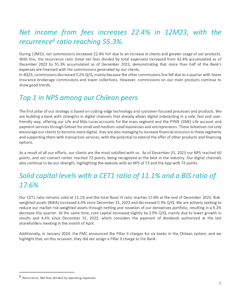 Net income from fees increases 22 . 4 % in 12 M 23 , with the recurrence 6 ratio reaching 55 . 3 % . During 12 M 23 , net commissions increased 22 . 4 % YoY due to an increase in clients and greater usage of our products . With this, the recurrence ratio (total net fees divided by total expenses) increased from 42 . 4 % accumulated as of December 2022 to 55 . 3 % accumulated as of December 2023 , demonstrating that more than half of the Bank's expenses are financed with the commissions generated by our clients . In 4 Q 23 , commissions decreased 5 . 2 % Q/Q, mainly because the other commissions line fell due to a quarter with fewer insurance brokerage commissions and lower collections . However, commissions on our main products continue to show good trends . Top 1 in NPS among our Chilean peers The first pillar of our strategy is based on cutting - edge technology and customer - focused processes and products . We are building a bank with strengths in digital channels that already allows digital onboarding in a safe, fast and user - friendly way, offering our Life and Más Lucas accounts for the mass segment and the PYME (SME) Life account and payment services through Getnet for small and medium - sized businesses and entrepreneurs . These initiatives not only encourage our clients to become more digital, they are also managing to increase financial inclusion in these segments and supporting them with transaction services, with the potential to extend the offer of other products and financing options . As a result of all our efforts, our clients are the most satisfied with us . As of December 31 , 2023 our NPS reached 60 points, and our contact center reached 72 points, being recognized as the best in the industry . Our digital channels also continue to be our strength, highlighting the website with an NPS of 73 and the App with 74 points . Solid capital levels with a CET1 ratio of 11.1% and a BIS ratio of 17.6% Our CET 1 ratio remains solid at 11 . 1 % and the total Basel III ratio reaches 17 . 6 % at the end of December 2023 . Risk - weighted assets (RWA) increased 4 . 0 % since December 31 , 2022 and decreased 0 . 9 % Q/Q . We are actively seeking to reduce our market risk - weighted assets through netting and novation of our derivatives portfolio, resulting in a 9 . 2 % decrease this quarter . At the same time, core capital increased slightly by 2 . 9 % Q/Q, mainly due to lower growth in results and 4 . 4 % since December 31 , 2022 , which considers the payment of dividends authorized at the last shareholders meeting in the month of April . Additionally, in January 2024 , the FMC announced the Pillar II charges for six banks in the Chilean system, and we highlight that, on this occasion, they did not assign a Pillar II charge to the Bank . 6 . Recurrence: Net fees divided by operating expenses. 5
