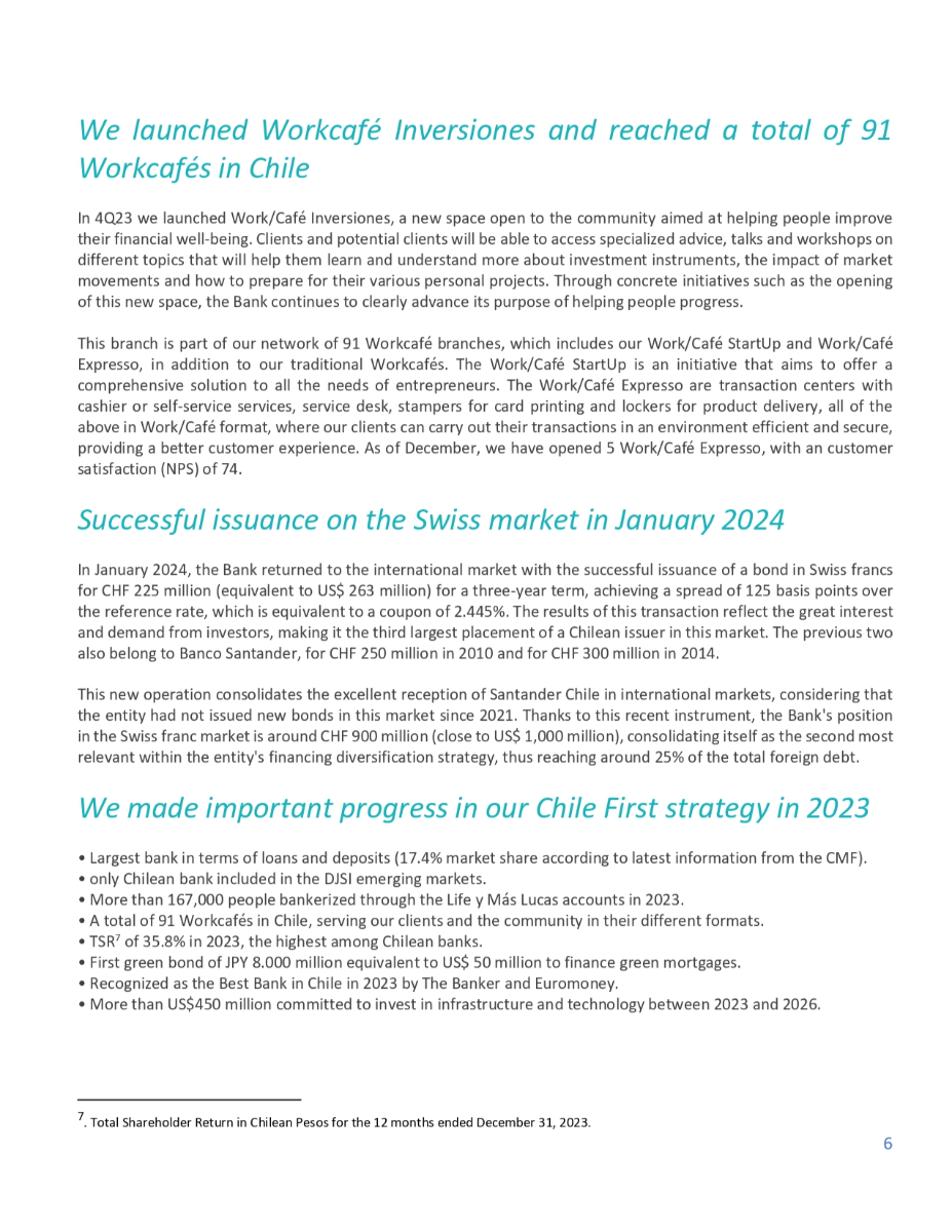 We launched Workcafé Inversiones and reached a total of 91 Workcafés in Chile In 4 Q 23 we launched Work/Café Inversiones, a new space open to the community aimed at helping people improve their financial well - being . Clients and potential clients will be able to access specialized advice, talks and workshops on different topics that will help them learn and understand more about investment instruments, the impact of market movements and how to prepare for their various personal projects . Through concrete initiatives such as the opening of this new space, the Bank continues to clearly advance its purpose of helping people progress . This branch is part of our network of 91 Workcafé branches, which includes our Work/Café StartUp and Work/Café Expresso, in addition to our traditional Workcafés . The Work/Café StartUp is an initiative that aims to offer a comprehensive solution to all the needs of entrepreneurs . The Work/Café Expresso are transaction centers with cashier or self - service services, service desk, stampers for card printing and lockers for product delivery, all of the above in Work/Café format, where our clients can carry out their transactions in an environment efficient and secure, providing a better customer experience . As of December, we have opened 5 Work/Café Expresso, with an customer satisfaction (NPS) of 74 . Successful issuance on the Swiss market in January 2024 In January 2024 , the Bank returned to the international market with the successful issuance of a bond in Swiss francs for CHF 225 million (equivalent to US $ 263 million) for a three - year term, achieving a spread of 125 basis points over the reference rate, which is equivalent to a coupon of 2 . 445 % . The results of this transaction reflect the great interest and demand from investors, making it the third largest placement of a Chilean issuer in this market . The previous two also belong to Banco Santander, for CHF 250 million in 2010 and for CHF 300 million in 2014 . This new operation consolidates the excellent reception of Santander Chile in international markets, considering that the entity had not issued new bonds in this market since 2021 . Thanks to this recent instrument, the Bank's position in the Swiss franc market is around CHF 900 million (close to US $ 1 , 000 million), consolidating itself as the second most relevant within the entity's financing diversification strategy, thus reaching around 25 % of the total foreign debt . We made important progress in our Chile First strategy in 2023 • Largest bank in terms of loans and deposits (17.4% market share according to latest information from the CMF). • only Chilean bank included in the DJSI emerging markets. • More than 167,000 people bankerized through the Life y Más Lucas accounts in 2023. • A total of 91 Workcafés in Chile, serving our clients and the community in their different formats. • TSR 7 of 35.8% in 2023, the highest among Chilean banks. • First green bond of JPY 8.000 million equivalent to US$ 50 million to finance green mortgages. • Recognized as the Best Bank in Chile in 2023 by The Banker and Euromoney. • More than US$450 million committed to invest in infrastructure and technology between 2023 and 2026. 7 . Total Shareholder Return in Chilean Pesos for the 12 months ended December 31, 2023. 6