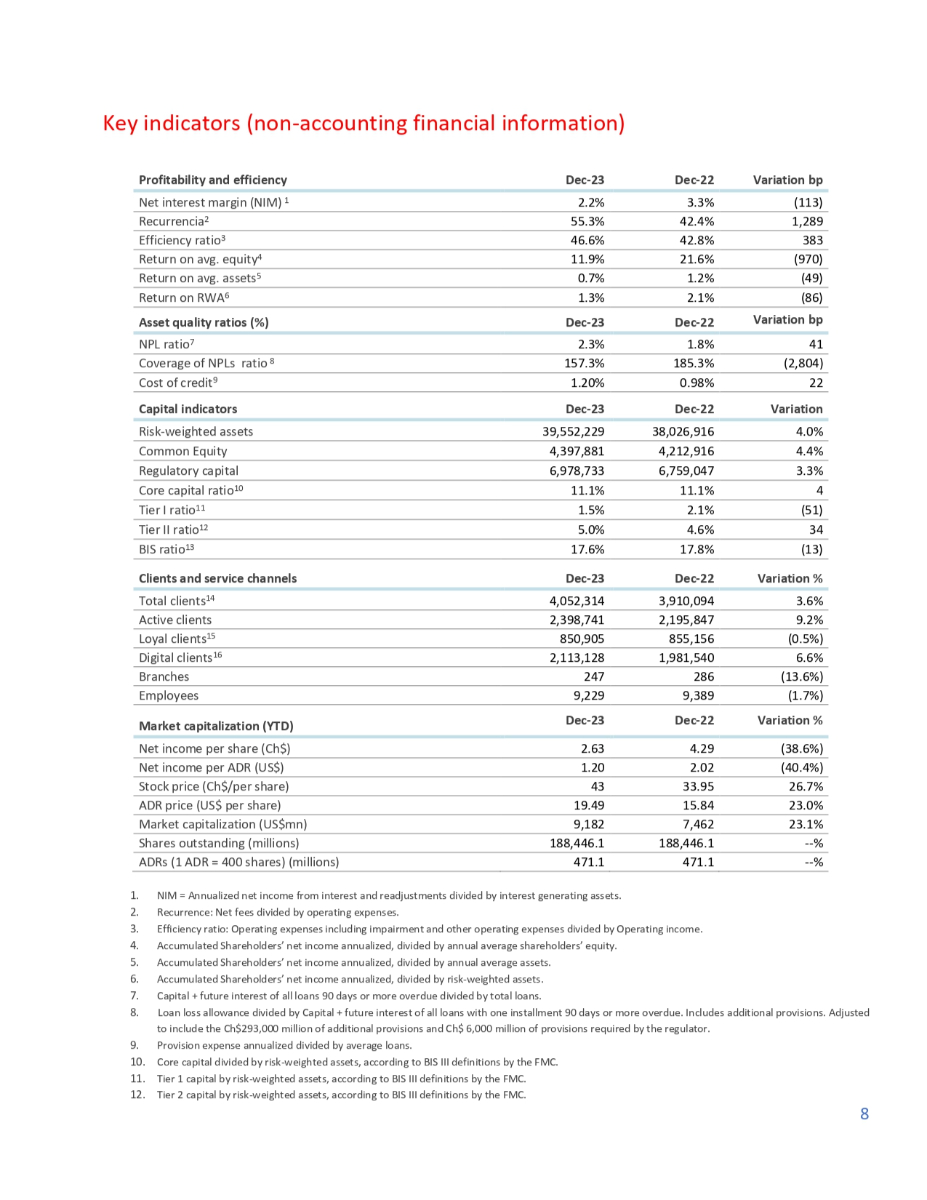 7 Key financial information % Variation Dec - 22 Dec - 23 Balance Sheet (Ch$ million) 4.0% 68,164,604 70,857,888 Total assets 5.3% 38,871,708 40,917,143 Total gross loans 1 (3.9%) 14,086,226 13,537,826 Demand deposits 24.3% 12,978,790 16,137,942 Time deposits 5.8% 4,128,808 4,367,158 Total shareholders’ equity % Variation Dec - 22 Dec - 23 Income Statement (YTD) (29.8%) 1,598,345 1,121,438 Net income from interest and readjustment 23.4% 407,269 502,640 Net fee and commission income 37.9% 217,653 300,239 Net financial results (13.1%) 2,245,340 1,950,445 Total operating income 2 (5.4%) (961,326) (909,698) Operating expenses 3 (18.9%) 1,284,014 1,040,748 Net operating income before credit loss expenses 27.7% (370,727) (473,593) Credit loss expenses (37.9%) 913,287 567,155 Net operating income before income tax (38.6%) 808,651 496,404 Income attributable to shareholders 1. Loans (including interbank loans) at amortized cost and loans at fair value through other comprehensive income. 2. Total operating income: Net income from interest and readjustments + net fee income + net financial results+ income from investments in associates and other companies+ results from non - current assets and non - continued operations+ other operating income 3. Operating expenses: Personnel expenses + administration expenses+ depreciation and amortization+ impairment of non - financial assets + other operating expenses