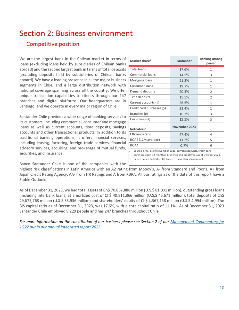 Section 2: Business environment Competitive position We are the largest bank in the Chilean market in terms of loans (excluding loans held by subsidiaries of Chilean banks abroad) and the second largest bank in terms of total deposits (excluding deposits held by subsidiaries of Chilean banks aboard) . We have a leading presence in all the major business segments in Chile, and a large distribution network with national coverage spanning across all the country . We offer unique transaction capabilities to clients through our 247 branches and digital platforms . Our headquarters are in Santiago, and we operate in every major region of Chile . Santander Chile provides a wide range of banking services to its customers, including commercial, consumer and mortgage loans as well as current accounts, time deposits, savings accounts and other transactional products . In addition to its traditional banking operations, it offers financial services, including leasing, factoring, foreign trade services, financial advisory services, acquiring, and brokerage of mutual funds, securities, and insurance . Banco Santander Chile is one of the companies with the highest risk classifications in Latin America with an A 2 rating from Moody's, A - from Standard and Poor's, A+ from Japan Credit Rating Agency, AA - from HR Ratings and A from KBRA . All our ratings as of the date of this report have a Stable Outlook . As of December 31 , 2023 , we had total assets of Ch $ 70 , 857 , 888 million (U . S . $ 81 , 031 million), outstanding gross loans (including interbank loans) at amortized cost of Ch $ 40 , 811 , 866 million (U . S . $ 46 , 671 million), total deposits of Ch $ 29 , 675 , 768 million (U . S . $ 33 , 936 million) and shareholders’ equity of Ch $ 4 , 367 , 158 million (U . S . $ 4 , 994 million) . The BIS capital ratio as of December 31 , 2023 , was 17 . 6 % , with a core capital ratio of 11 . 1 % . As of December 31 , 2023 Santander Chile employed 9 , 229 people and has 247 branches throughout Chile . For more information on the constitution of our business please see Section 2 of our Management Commentary for 1 Q 22 our in our annual integrated report 2023 . Ranking among peers 2 Market share 1 Santander 1 17.6% Total loans 3 14.5% Commercial loans 1 21.2% Mortgage loans 1 19.7% Consumer loans 2 20.3% Demand deposits 2 15.5% Time deposits 1 26.5% Current accounts (#) 1 23.4% Credit card purchases ($) 3 16.3% Branches (#) 3 15.5% Employees (#) November 2023 Indicators 1 4 47.4% Efficiency ratio 5 11.2% ROAE (12M average) 6 0.7% ROAA . Source: FMC, as of November 2023, current accounts, credit card purchases (last 12 months), branches and employees as of October 2023. Peers: Banco de Chile, BCI, Banco Estado, Itaú y Scotiabank 10