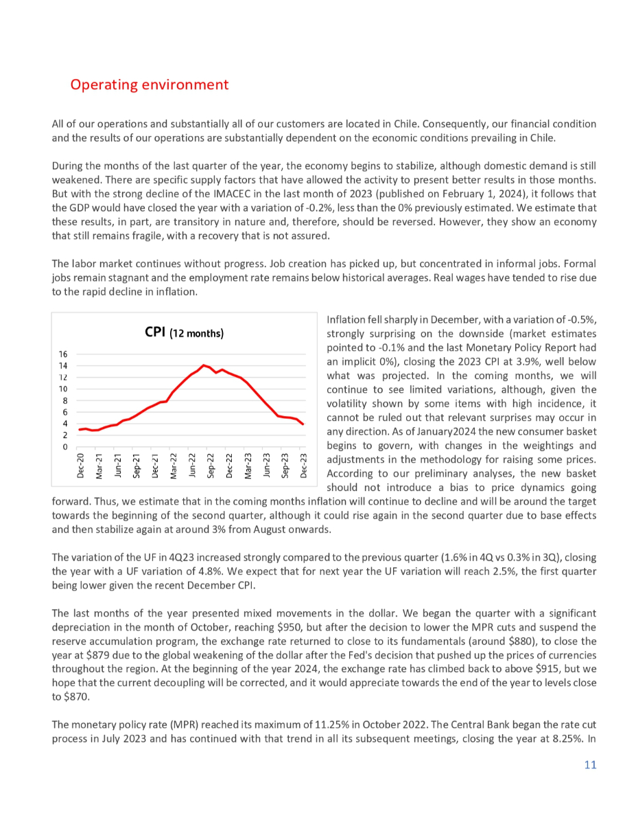 Operating environment All of our operations and substantially all of our customers are located in Chile . Consequently, our financial condition and the results of our operations are substantially dependent on the economic conditions prevailing in Chile . During the months of the last quarter of the year, the economy begins to stabilize, although domestic demand is still weakened . There are specific supply factors that have allowed the activity to present better results in those months . But with the strong decline of the IMACEC in the last month of 2023 (published on February 1 , 2024 ), it follows that the GDP would have closed the year with a variation of - 0 . 2 % , less than the 0 % previously estimated . We estimate that these results, in part, are transitory in nature and, therefore, should be reversed . However, they show an economy that still remains fragile, with a recovery that is not assured . The labor market continues without progress . Job creation has picked up, but concentrated in informal jobs . Formal jobs remain stagnant and the employment rate remains below historical averages . Real wages have tended to rise due to the rapid decline in inflation . Inflation fell sharply in December, wit h a variation of - 0 . 5 % , strongly surprising on the downside (market estimates pointed to - 0 . 1 % an d the last Monetary Policy Rep o rt had a n implicit 0 % ), closing the 2023 CPI at 3 . 9 % , w ell b el o w what wa s projected . I n the coming months, we will continue to see limited variations, although, given the volatility shown by some items wit h high incidence, it cannot be rule d out that relevant su rprise s may occur in any direction . A s of January 2024 the n ew consumer basket begins to govern, wit h changes in the weightings an d adjustments in the methodology for raising some prices . According to our preliminary analyses, the new basket should not introduce a bias to price dynamics going forward . Thus, we estimate that in the coming months inflation will continue to decline and will be around the target towards the beginning of the second quarter, although it could rise again in the second quarter due to base effects and then stabilize again at around 3 % from August onwards . The variation of the UF in 4 Q 23 increased strongly compared to the previous quarter ( 1 . 6 % in 4 Q vs 0 . 3 % in 3 Q), closing the year with a UF variation of 4 . 8 % . We expect that for next year the UF variation will reach 2 . 5 % , the first quarter being lower given the recent December CPI . The last months of the year presented mixed movements in the dollar . We began the quarter with a significant depreciation in the month of October, reaching $ 950 , but after the decision to lower the MPR cuts and suspend the reserve accumulation program, the exchange rate returned to close to its fundamentals (around $ 880 ), to close the year at $ 879 due to the global weakening of the dollar after the Fed's decision that pushed up the prices of currencies throughout the region . At the beginning of the year 2024 , the exchange rate has climbed back to above $ 915 , but we hope that the current decoupling will be corrected, and it would appreciate towards the end of the year to levels close to $ 870 . The monetary policy rate (MPR) reached its maximum of 11 . 25 % in October 2022 . The Central Bank began the rate cut process in July 2023 and has continued with that trend in all its subsequent meetings, closing the year at 8 . 25 % . In 11