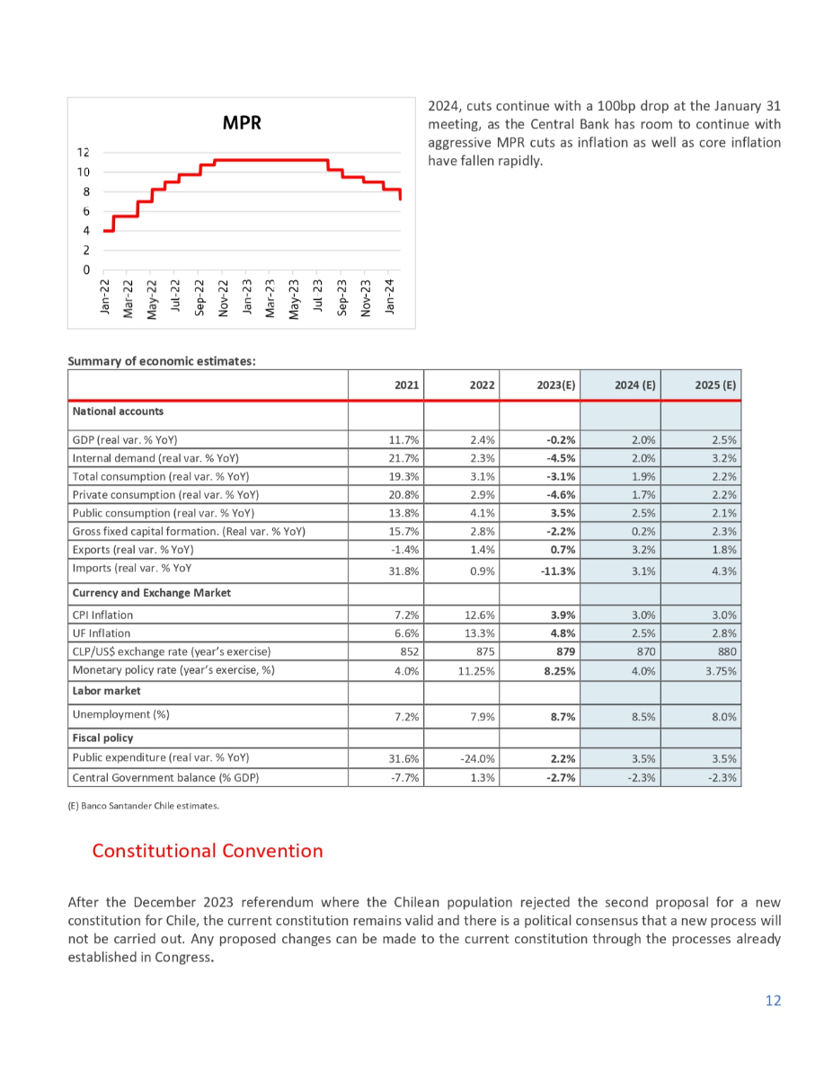 2024 , cuts continue with a 100 bp drop at the January 31 meeting, as the Central Bank has room to continue with aggressive MPR cuts as inflation as well as core inflation have fallen rapidly . Summary of economic estimates: 2025 (E) 2024 (E) 2023(E) 2022 2021 National accounts 2.5% 2.0% - 0.2% 2.4% 11.7% GDP (real var. % YoY) 3.2% 2.0% - 4.5% 2.3% 21.7% Internal demand (real var. % YoY) 2.2% 1.9% - 3.1% 3.1% 19.3% Total consumption (real var. % YoY) 2.2% 1.7% - 4.6% 2.9% 20.8% Private consumption (real var. % YoY) 2.1% 2.5% 3.5% 4.1% 13.8% Public consumption (real var. % YoY) 2.3% 0.2% - 2.2% 2.8% 15.7% Gross fixed capital formation. (Real var. % YoY) 1.8% 3.2% 0.7% 1.4% - 1.4% Exports (real var. % YoY) 4.3% 3.1% - 11.3% 0.9% 31.8% Imports (real var. % YoY Currency and Exchange Market 3.0% 3.0% 3.9% 12.6% 7.2% CPI Inflation 2.8% 2.5% 4.8% 13.3% 6.6% UF Inflation 880 870 879 875 852 CLP/US$ exchange rate (year’s exercise) 3.75% 4.0% 8.25% 11.25% 4.0% Monetary policy rate (year’s exercise, %) Labor market 8.0% 8.5% 8.7% 7.9% 7.2% Unemployment (%) Fiscal policy 3.5% 3.5% 2.2% - 24.0% 31.6% Public expenditure (real var. % YoY) - 2.3% - 2.3% - 2.7% 1.3% - 7.7% Central Government balance (% GDP) (E) Banco Santander Chile estimates. Constitutional Convention After the December 2023 referendum where the Chilean population rejected the second proposal for a new constitution for Chile, the current constitution remains valid and there is a political consensus that a new process will not be carried out . Any proposed changes can be made to the current constitution through the processes already established in Congress . 12