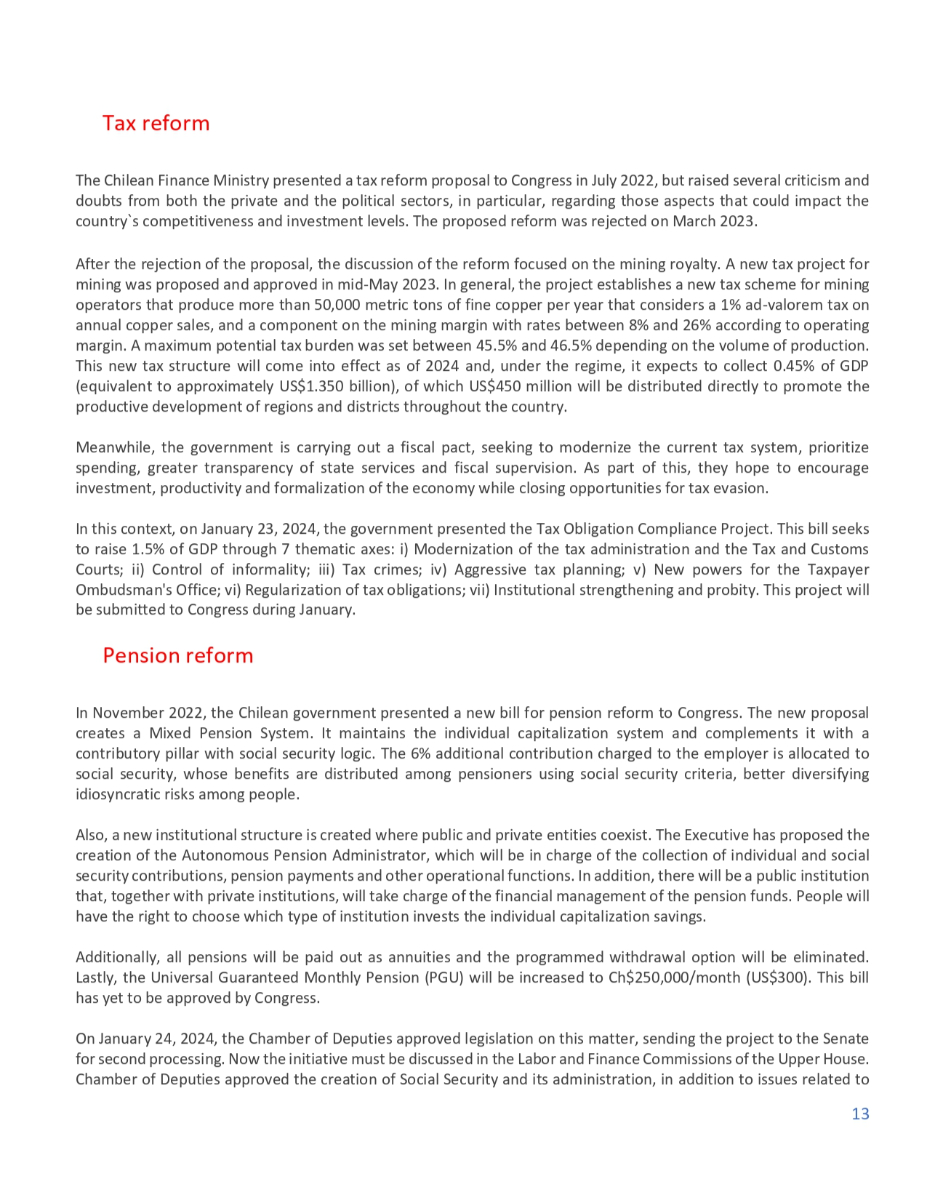 13 Tax reform The Chilean Finance Ministry presented a tax reform proposal to Congress in July 2022 , but raised several criticism and doubts from both the private and the political sectors, in particular, regarding those aspects that could impact the country`s competitiveness and investment levels . The proposed reform was rejected on March 2023 . After the rejection of the proposal, the discussion of the reform focused on the mining royalty . A new tax project for mining was proposed and approved in mid - May 2023 . In general, the project establishes a new tax scheme for mining operators that produce more than 50 , 000 metric tons of fine copper per year that considers a 1 % ad - valorem tax on annual copper sales, and a component on the mining margin with rates between 8 % and 26 % according to operating margin . A maximum potential tax burden was set between 45 . 5 % and 46 . 5 % depending on the volume of production . This new tax structure will come into effect as of 2024 and, under the regime, it expects to collect 0 . 45 % of GDP (equivalent to approximately US $ 1 . 350 billion), of which US $ 450 million will be distributed directly to promote the productive development of regions and districts throughout the country . Meanwhile, the government is carrying out a fiscal pact, seeking to modernize the current tax system, prioritize spending, greater transparency of state services and fiscal supervision . As part of this, they hope to encourage investment, productivity and formalization of the economy while closing opportunities for tax evasion . In this context, on January 23 , 2024 , the government presented the Tax Obligation Compliance Project . This bill seeks to raise 1 . 5 % of GDP through 7 thematic axes : i) Modernization of the tax administration and the Tax and Customs Courts ; ii) Control of informality ; iii) Tax crimes ; iv) Aggressive tax planning ; v) New powers for the Taxpayer Ombudsman's Office ; vi) Regularization of tax obligations ; vii) Institutional strengthening and probity . This project will be submitted to Congress during January . Pension reform In November 2022 , the Chilean government presented a new bill for pension reform to Congress . The new proposal creates a Mixed Pension System . It maintains the individual capitalization system and complements it with a contributory pillar with social security logic . The 6 % additional contribution charged to the employer is allocated to social security, whose benefits are distributed among pensioners using social security criteria, better diversifying idiosyncratic risks among people . Also, a new institutional structure is created where public and private entities coexist . The Executive has proposed the creation of the Autonomous Pension Administrator, which will be in charge of the collection of individual and social security contributions, pension payments and other operational functions . In addition, there will be a public institution that, together with private institutions, will take charge of the financial management of the pension funds . People will have the right to choose which type of institution invests the individual capitalization savings . Additionally, all pensions will be paid out as annuities and the programmed withdrawal option will be eliminated . Lastly, the Universal Guaranteed Monthly Pension (PGU) will be increased to Ch $ 250 , 000 /month (US $ 300 ) . This bill has yet to be approved by Congress . On January 24 , 2024 , the Chamber of Deputies approved legislation on this matter, sending the project to the Senate for second processing . Now the initiative must be discussed in the Labor and Finance Commissions of the Upper House . Chamber of Deputies approved the creation of Social Security and its administration, in addition to issues related to
