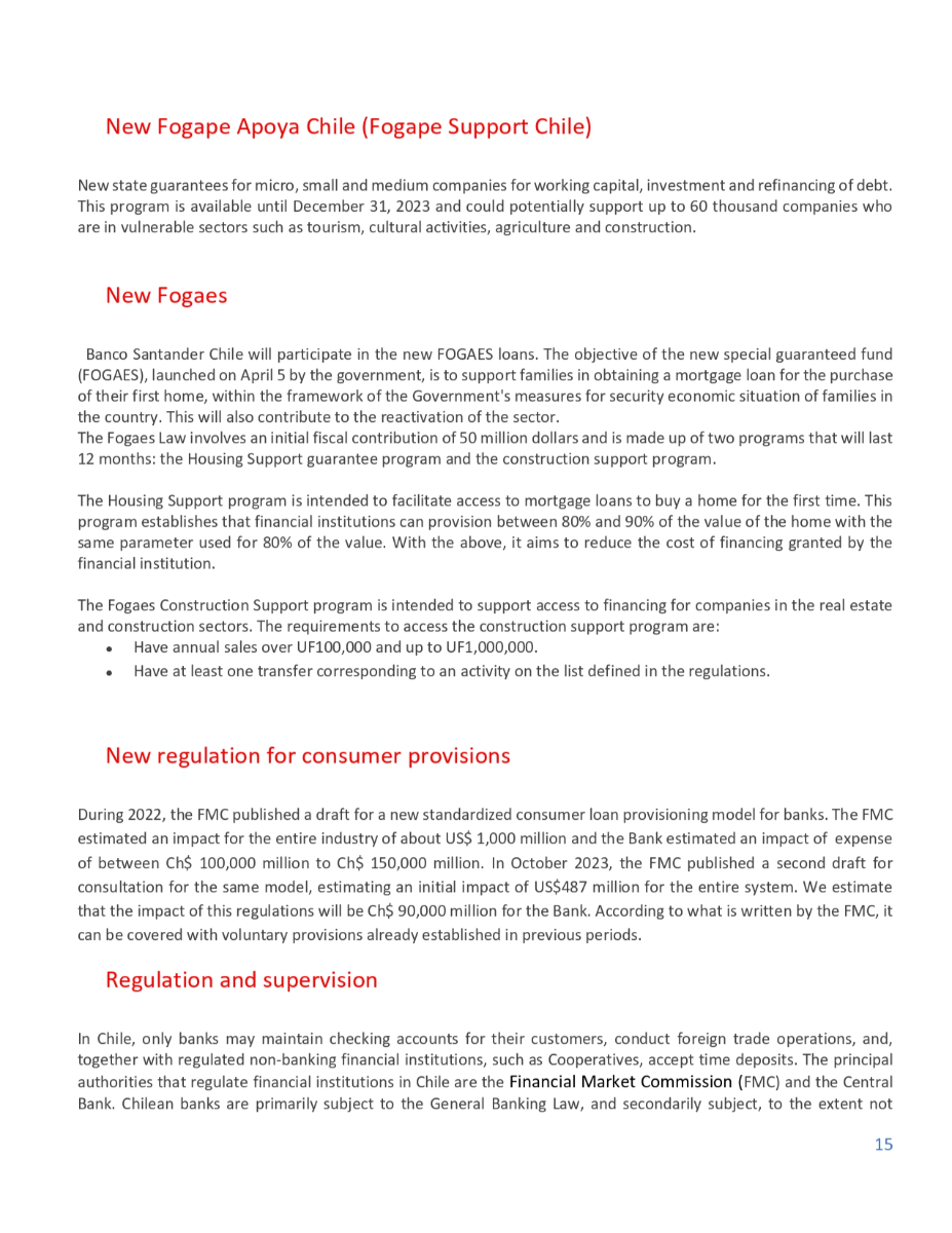 15 New Fogape Apoya Chile (Fogape Support Chile) New state guarantees for micro, small and medium companies for working capital, investment and refinancing of debt . This program is available until December 31 , 2023 and could potentially support up to 60 thousand companies who are in vulnerable sectors such as tourism, cultural activities, agriculture and construction . New Fogaes Banco Santander Chile will participate in the new FOGAES loans . The objective of the new special guaranteed fund (FOGAES), launched on April 5 by the government, is to support families in obtaining a mortgage loan for the purchase of their first home, within the framework of the Government's measures for security economic situation of families in the country . This will also contribute to the reactivation of the sector . The Fogaes Law involves an initial fiscal contribution of 50 million dollars and is made up of two programs that will last 12 months : the Housing Support guarantee program and the construction support program . The Housing Support program is intended to facilitate access to mortgage loans to buy a home for the first time . This program establishes that financial institutions can provision between 80 % and 90 % of the value of the home with the same parameter used for 80 % of the value . With the above, it aims to reduce the cost of financing granted by the financial institution . The Fogaes Construction Support program is intended to support access to financing for companies in the real estate and construction sectors. The requirements to access the construction support program are: ● Have annual sales over UF100,000 and up to UF1,000,000. ● Have at least one transfer corresponding to an activity on the list defined in the regulations. New regulation for consumer provisions During 2022 , the FMC published a draft for a new standardized consumer loan provisioning model for banks . The FMC estimated an impact for the entire industry of about US $ 1 , 000 million and the Bank estimated an impact of expense of between Ch $ 100 , 000 million to Ch $ 150 , 000 million . In October 2023 , the FMC published a second draft for consultation for the same model, estimating an initial impact of US $ 487 million for the entire system . We estimate that the impact of this regulations will be Ch $ 90 , 000 million for the Bank . According to what is written by the FMC, it can be covered with voluntary provisions already established in previous periods . Regulation and supervision In Chile, only banks may maintain checking accounts for their customers, conduct foreign trade operations, and, together with regulated non - banking financial institutions, such as Cooperatives, accept time deposits . The principal authorities that regulate financial institutions in Chile are the Financial Market Commission ( FMC) and the Central Bank . Chilean banks are primarily subject to the General Banking Law, and secondarily subject, to the extent not
