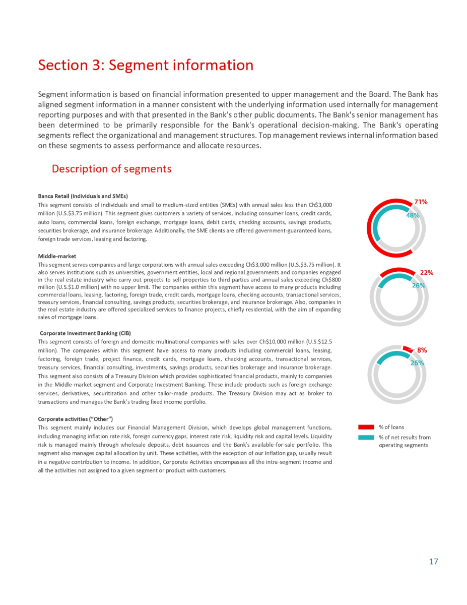 Section 3: Segment information Segment information is based on financial information presented to upper management and the Board . The Bank has aligned segment information in a manner consistent with the underlying information used internally for management reporting purposes and with that presented in the Bank's other public documents . The Bank's senior management has been determined to be primarily responsible for the Bank's operational decision - making . The Bank's operating segments reflect the organizational and management structures . Top management reviews internal information based on these segments to assess performance and allocate resources . Description of segments Banca Retail (Individuals and SMEs) This segment consists of individuals and small to medium - sized entities (SMEs) with annual sales less than Ch $ 3 , 000 million (U . S . $ 3 . 75 million) . This segment gives customers a variety of services, including consumer loans, credit cards, auto loans, commercial loans, foreign exchange, mortgage loans, debit cards, checking accounts, savings products, securities brokerage, and insurance brokerage . Additionally, the SME clients are offered government - guaranteed loans, foreign trade services, leasing and factoring . Middle - market This segment serves companies and large corporations with annual sales exceeding Ch $ 3 , 000 million (U . S . $ 3 . 75 million) . It also serves institutions such as universities, government entities, local and regional governments and companies engaged in the real estate industry who carry out projects to sell properties to third parties and annual sales exceeding Ch $ 800 million (U . S . $ 1 . 0 million) with no upper limit . The companies within this segment have access to many products including commercial loans, leasing, factoring, foreign trade, credit cards, mortgage loans, checking accounts, transactional services, treasury services, financial consulting, savings products, securities brokerage, and insurance brokerage . Also, companies in the real estate industry are offered specialized services to finance projects, chiefly residential, with the aim of expanding sales of mortgage loans . Corporate Investment Banking (CIB) This segment consists of foreign and domestic multinational companies with sales over Ch $ 10 , 000 million (U . S . $ 12 . 5 million) . The companies within this segment have access to many products including commercial loans, leasing, factoring, foreign trade, project finance, credit cards, mortgage loans, checking accounts, transactional services, treasury services, financial consulting, investments, savings products, securities brokerage and insurance brokerage . This segment also consists of a Treasury Division which provides sophisticated financial products, mainly to companies in the Middle - market segment and Corporate Investment Banking . These include products such as foreign exchange services, derivatives, securitization and other tailor - made products . The Treasury Division may act as broker to transactions and manages the Bank’s trading fixed income portfolio . Corporate activities (“Other”) This segment mainly includes our Financial Management Division, which develops global management functions, including managing inflation rate risk, foreign currency gaps, interest rate risk, liquidity risk and capital levels . Liquidity risk is managed mainly through wholesale deposits, debt issuances and the Bank’s available - for - sale portfolio . This segment also manages capital allocation by unit . These activities, with the exception of our inflation gap, usually result in a negative contribution to income . In addition, Corporate Activities encompasses all the intra - segment income and all the activities not assigned to a given segment or product with customers . % of loans % of net results from operating segments 17
