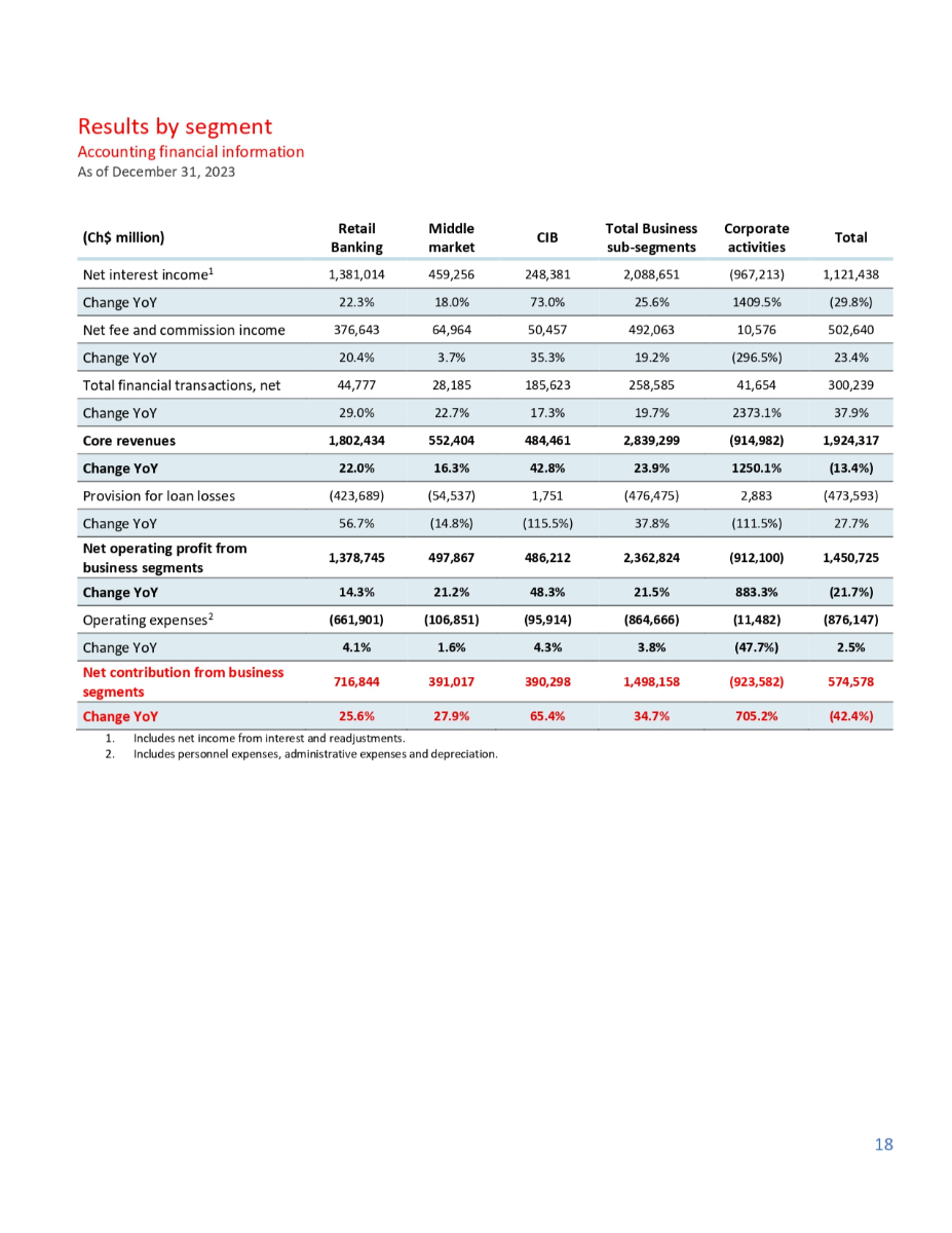 18 Results by segment Accounting financial information As of December 31, 2023 Total Corporate activities Total Business sub - segments CIB Middle market Retail Banking (Ch$ million) 1,121,438 (967,213) 2,088,651 248,381 459,256 1,381,014 Net interest income 1 (29.8%) 1409.5% 25.6% 73.0% 18.0% 22.3% Change YoY 502,640 10,576 492,063 50,457 64,964 376,643 Net fee and commission income 23.4% (296.5%) 19.2% 35.3% 3.7% 20.4% Change YoY 300,239 41,654 258,585 185,623 28,185 44,777 Total financial transactions, net 37.9% 2373.1% 19.7% 17.3% 22.7% 29.0% Change YoY 1,924,317 (914,982) 2,839,299 484,461 552,404 1,802,434 Core revenues (13.4%) 1250.1% 23.9% 42.8% 16.3% 22.0% Change YoY (473,593) 2,883 (476,475) 1,751 (54,537) (423,689) Provision for loan losses 27.7% (111.5%) 37.8% (115.5%) (14.8%) 56.7% Change YoY 1,450,725 (912,100) 2,362,824 486,212 497,867 1,378,745 Net operating profit from business segments (21.7%) 883.3% 21.5% 48.3% 21.2% 14.3% Change YoY (876,147) (11,482) (864,666) (95,914) (106,851) (661,901) Operating expenses 2 2.5% (47.7%) 3.8% 4.3% 1.6% 4.1% Change YoY 574,578 (923,582) 1,498,158 390,298 391,017 716,844 Net contribution from business segments (42.4%) 705.2% 34.7% 65.4% 27.9% 25.6% Change YoY 1. Includes net income from interest and readjustments. 2. Includes personnel expenses, administrative expenses and depreciation.